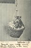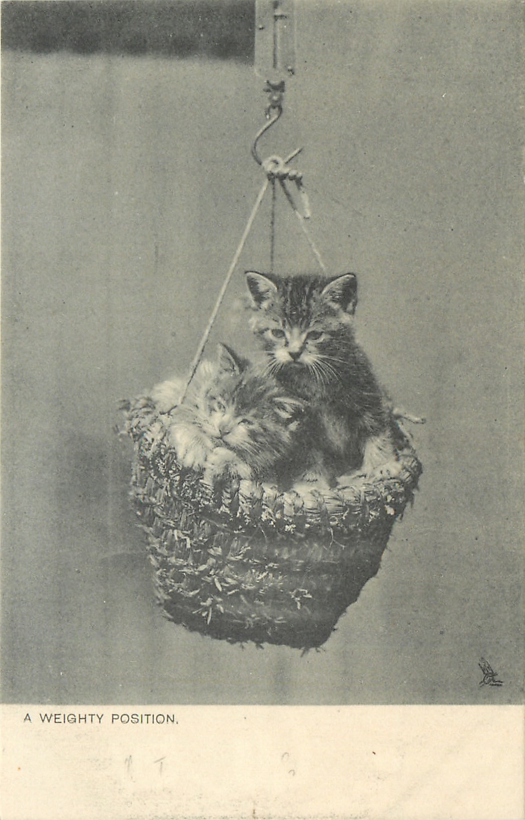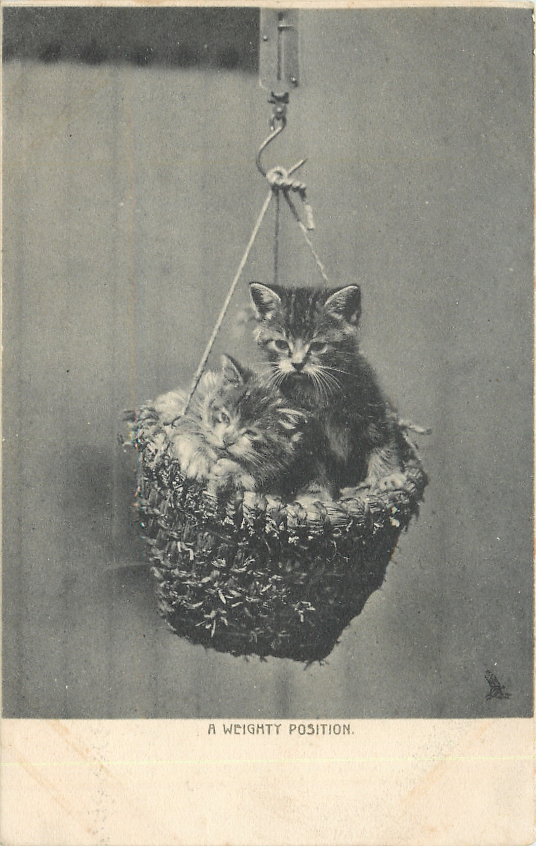 A WEIGHTY POSITION two kittens, basket hanging from scale
