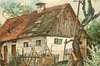 tree to right in front of house, one chimney, fence front & right of house, 2 doors left