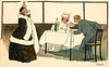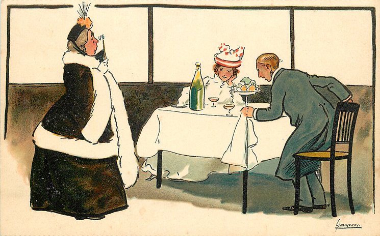 dissaproving aunt looks through lorgnettes at pretty young lady dining with her nephew