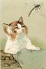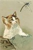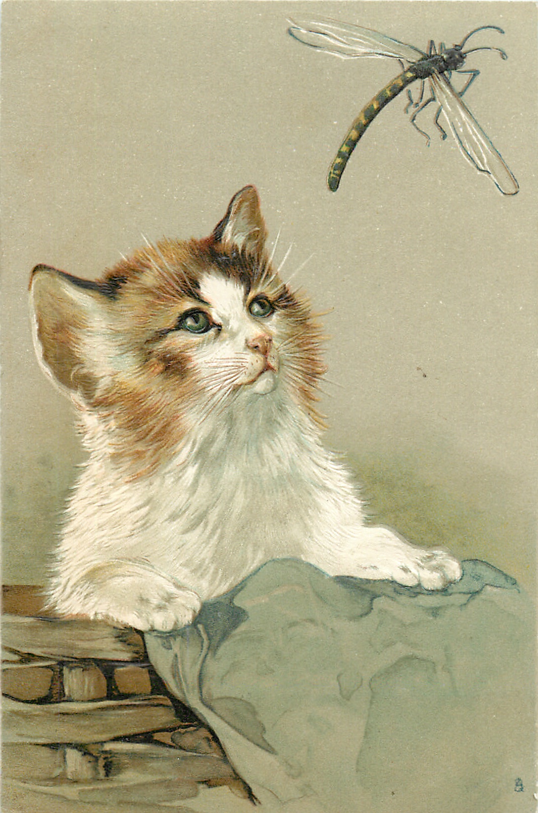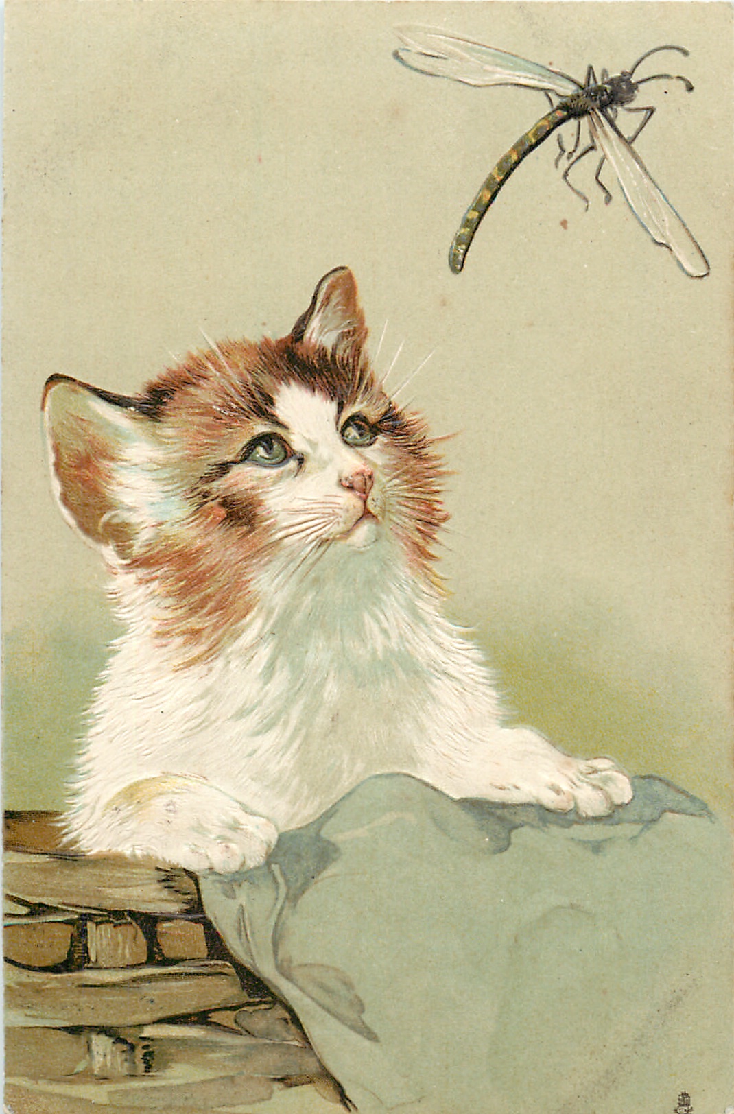 cat in basket looks up at dragon fly