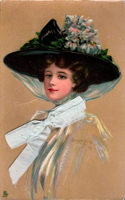 lady in beige, facing left with large black hat secured by blue filmy scarf and blue ribbon applique