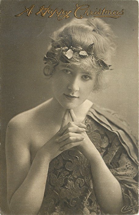 beautiful girl with leafy headband, dress off her right shoulder, hands together with index fingers under her chin, faces & looks front