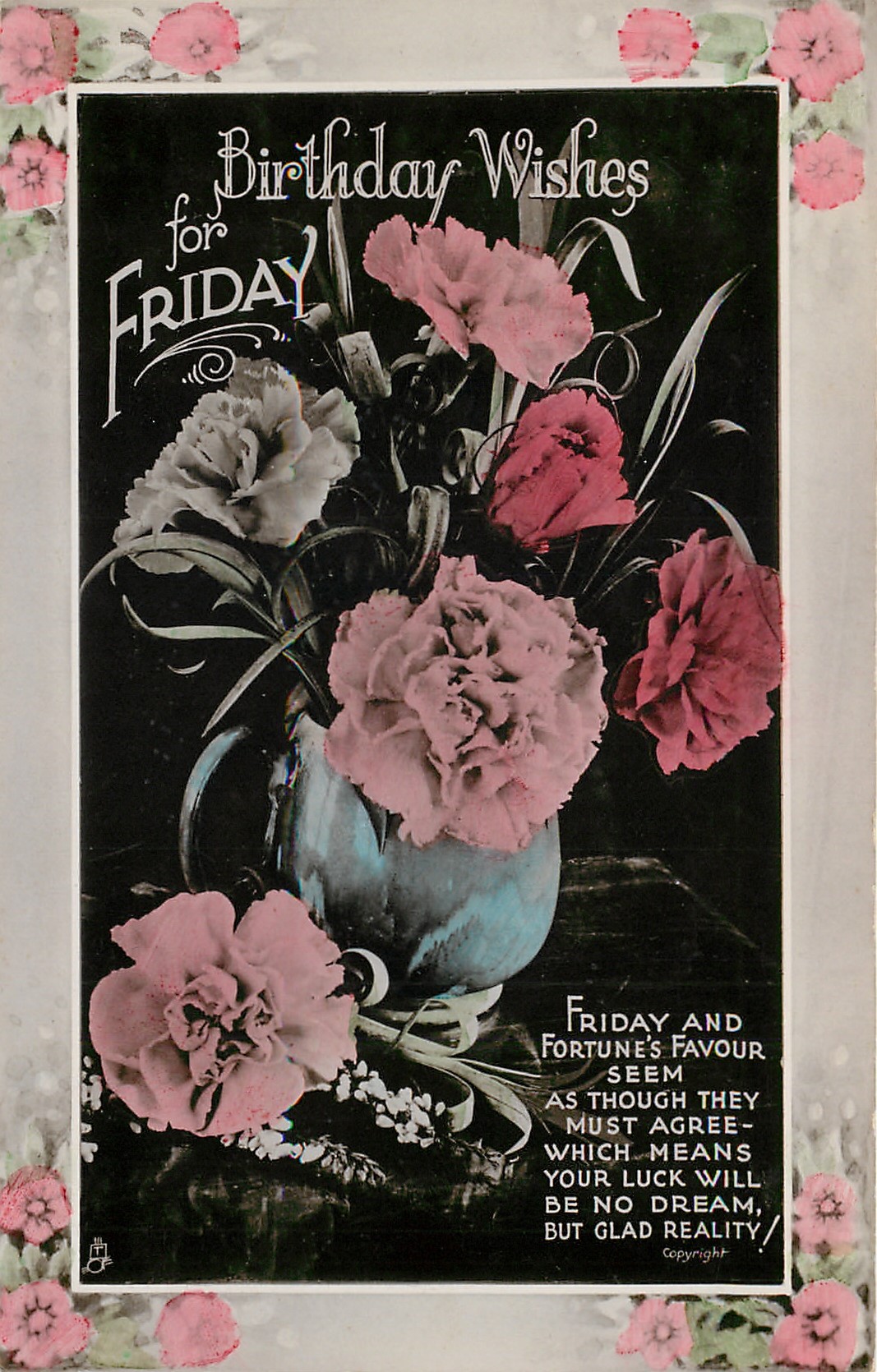 verse: FRIDAY AND FORTUNE'S FAVOUR SEEM AS THOUGH THEY MUST AGREE- WHICH MEANS YOUR LUCK WILL BE NO DREAM, BUT GLAD REALITY!