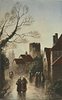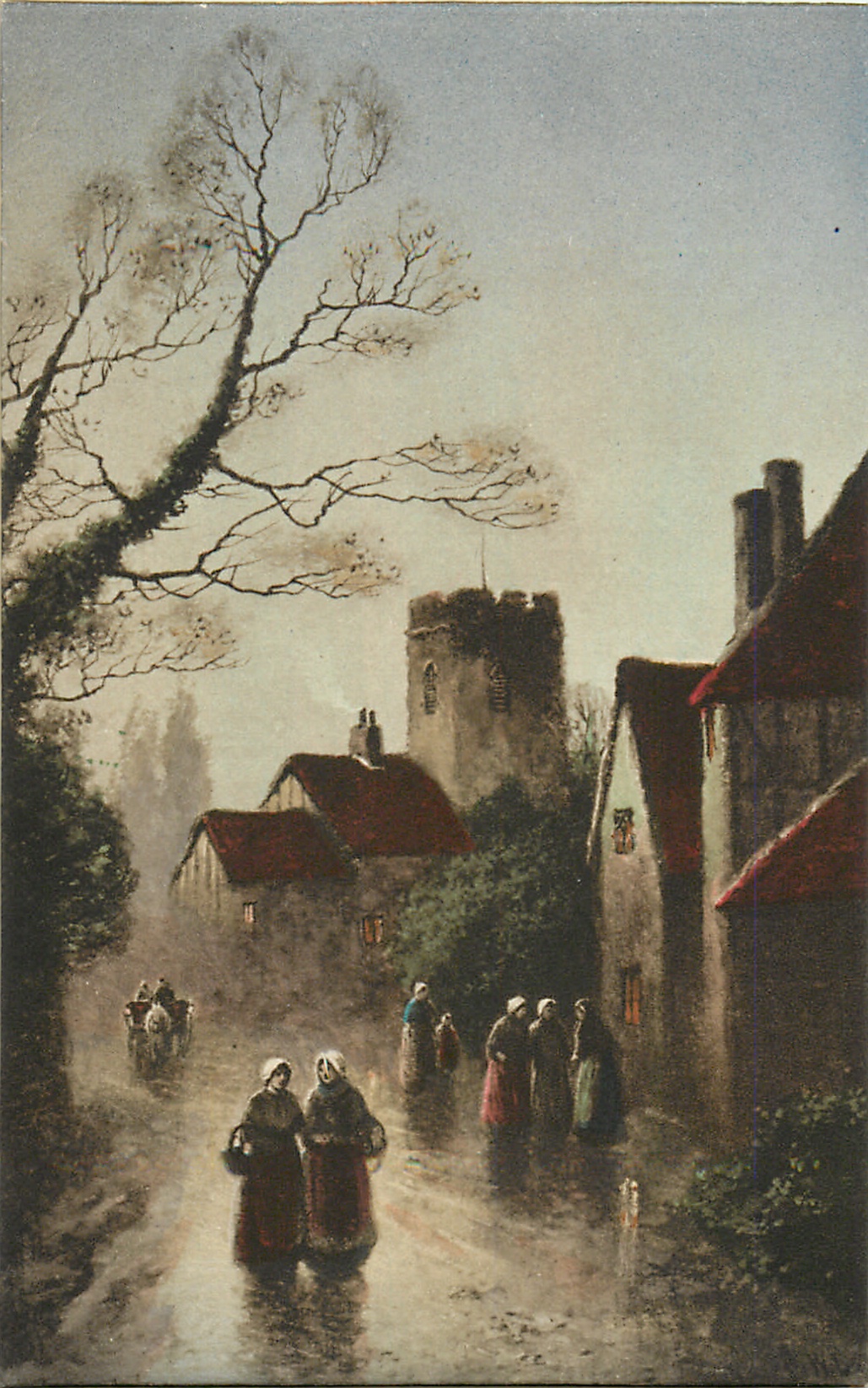 buildings and church right, group in front of buildings right*