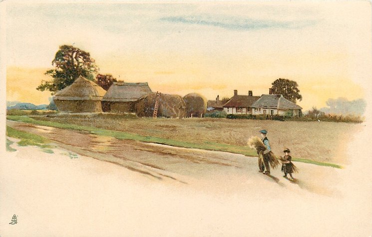 man and child on road carry sheaves towards farm at back