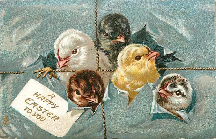 A HAPPY EASTER TO YOU five chicks poke their heads through wrappings of a parcel tied with string