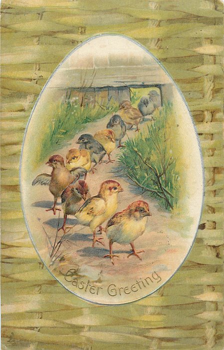 EASTER GREETING egg shaped inset of chicks walking forward down path, plaited fence surround