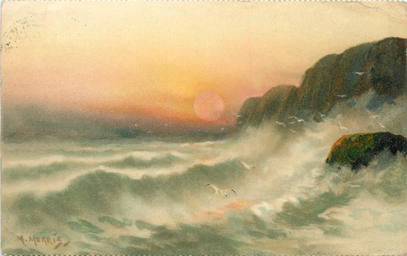 waves, large rock right, red sky, one gull below wave, others above, no land left
