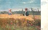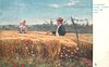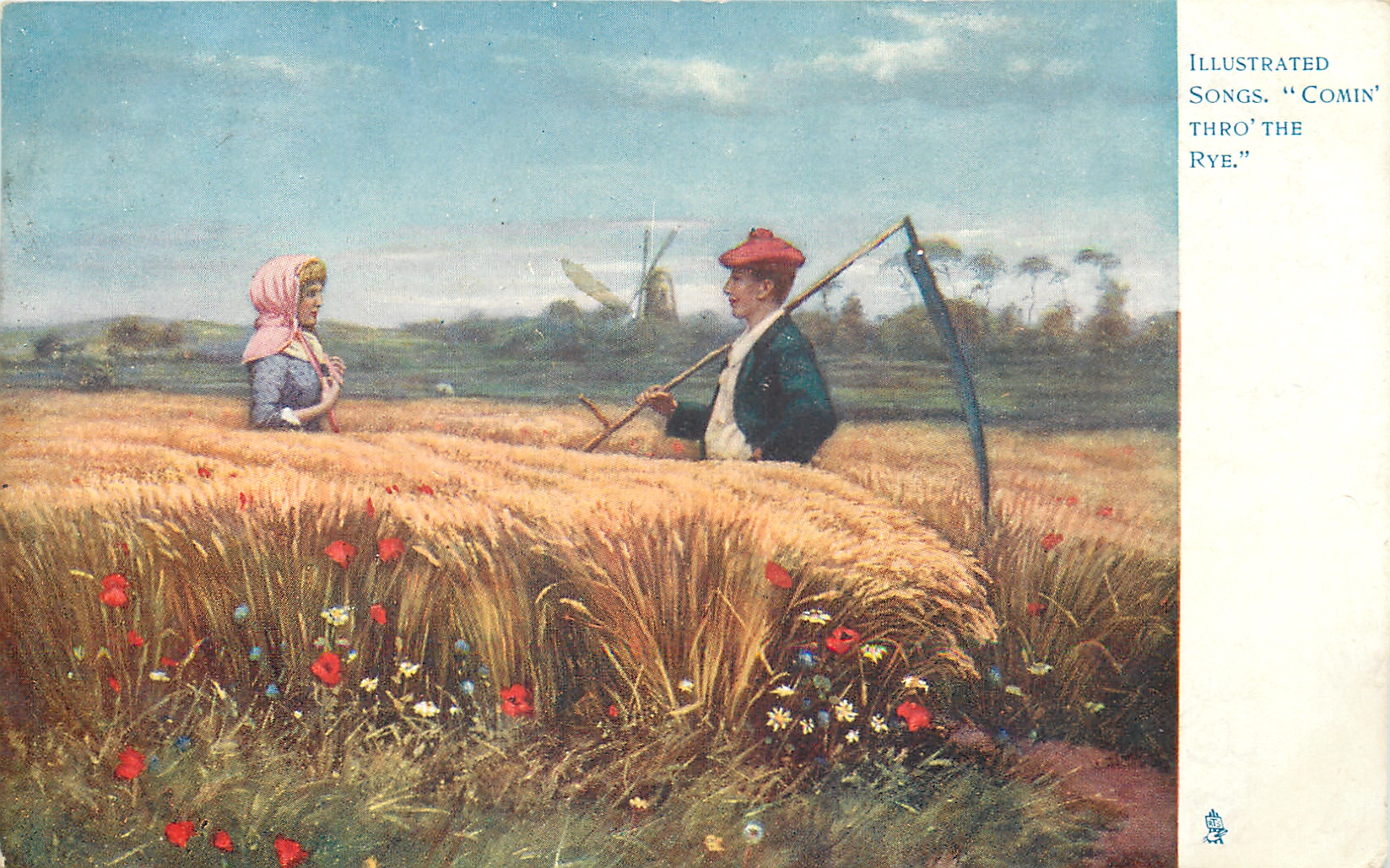 "COMIN' THRO' THE RYE." man with scythe looking left in rye field, woman facing man