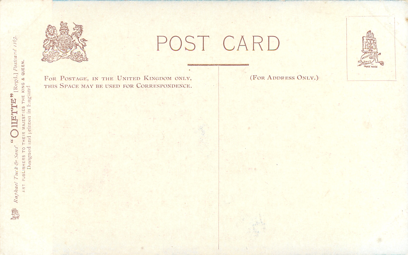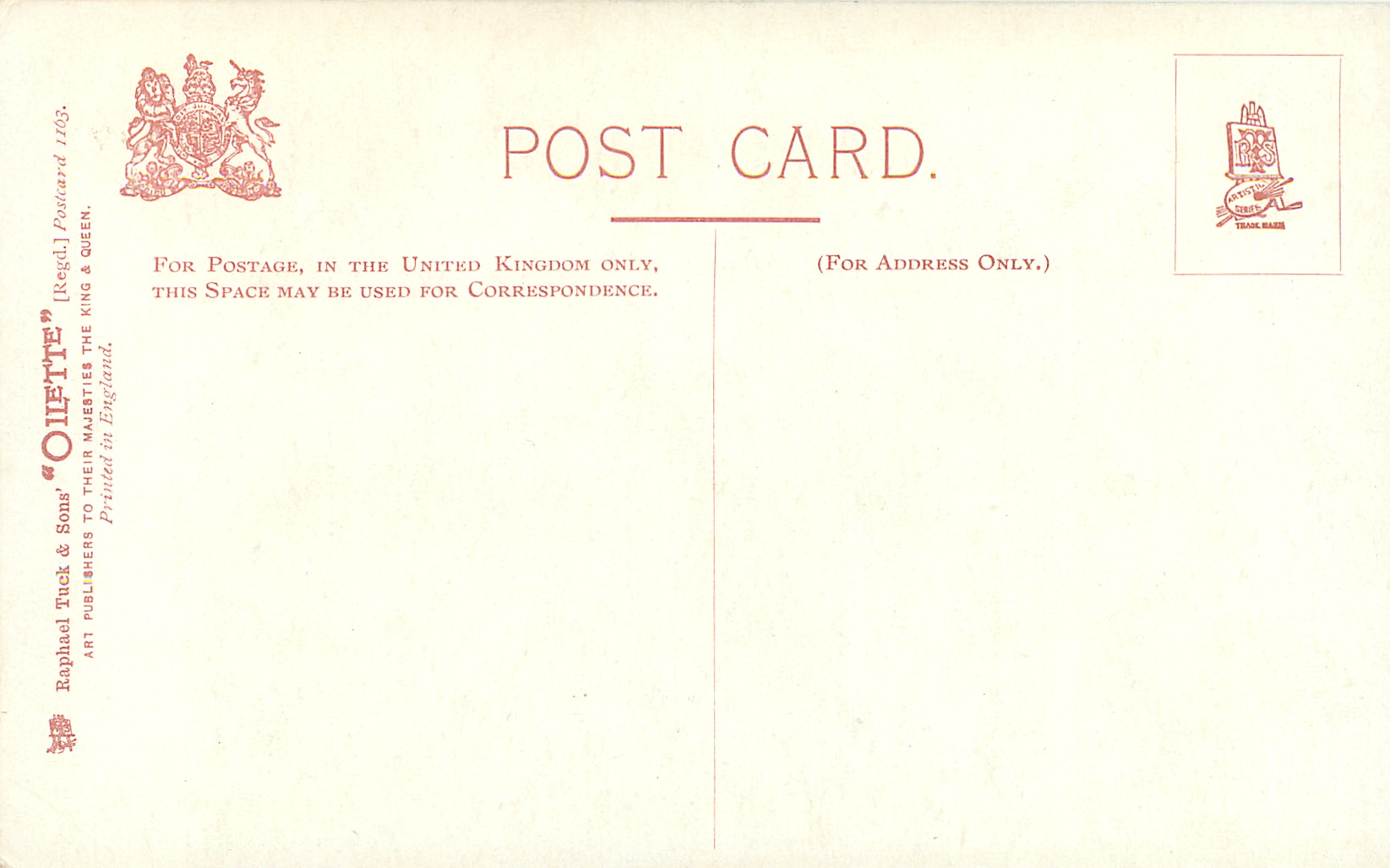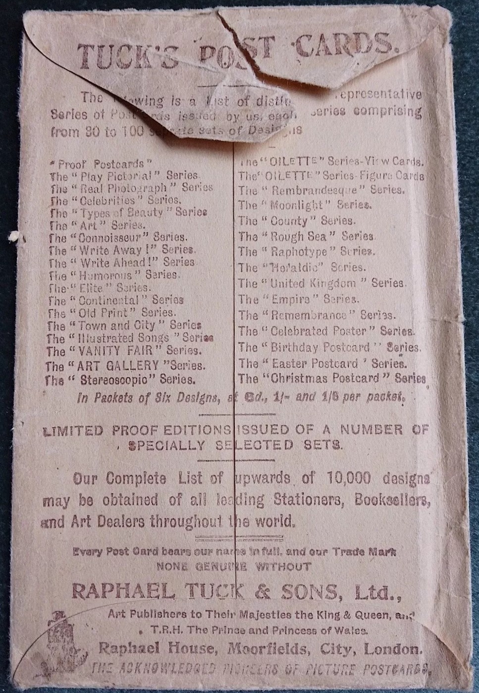 OILETTE or ART (u/b), 5 backs, u/b or d/b, PRINTED IN ENGLAND or not, come with & w/o white border for inscriptions, listed in 1904 & 1908/1909 & 1911/1912 Postcard Catalogues. 6 Cards in set cover all had white border with title.