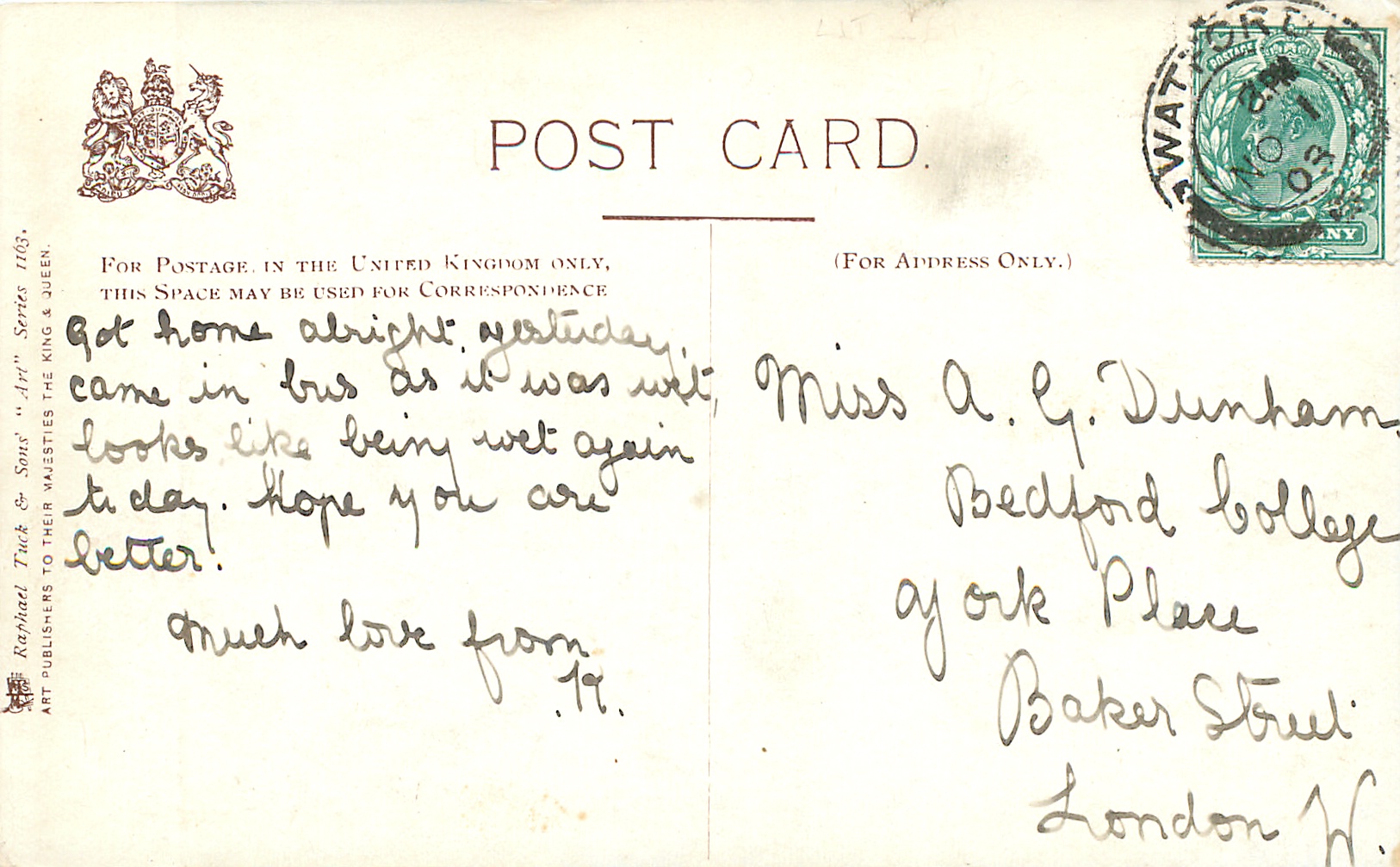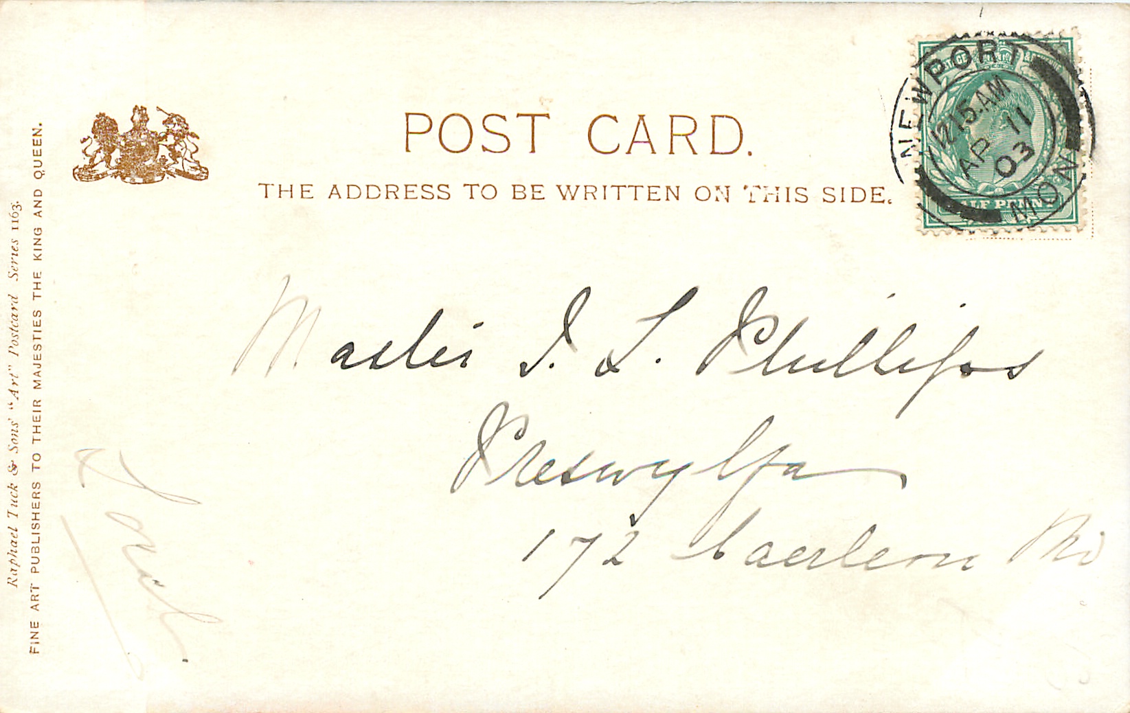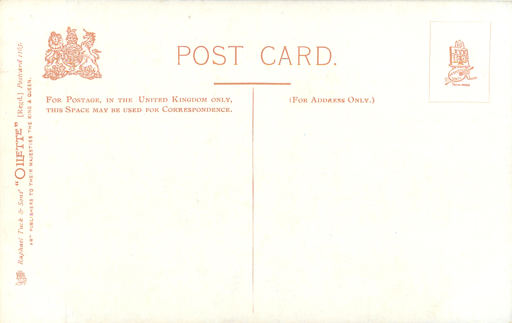 OILETTE or ART (u/b), 5 backs, u/b or d/b, PRINTED IN ENGLAND or not, come with & w/o white border for inscriptions, listed in 1904 & 1908/1909 & 1911/1912 Postcard Catalogues. 6 Cards in set cover all had white border with title.