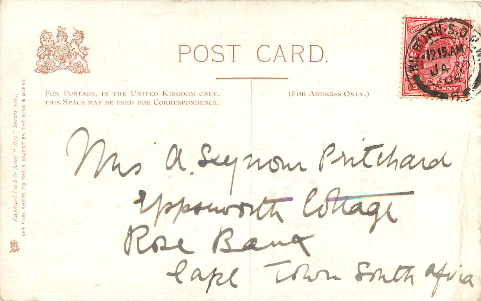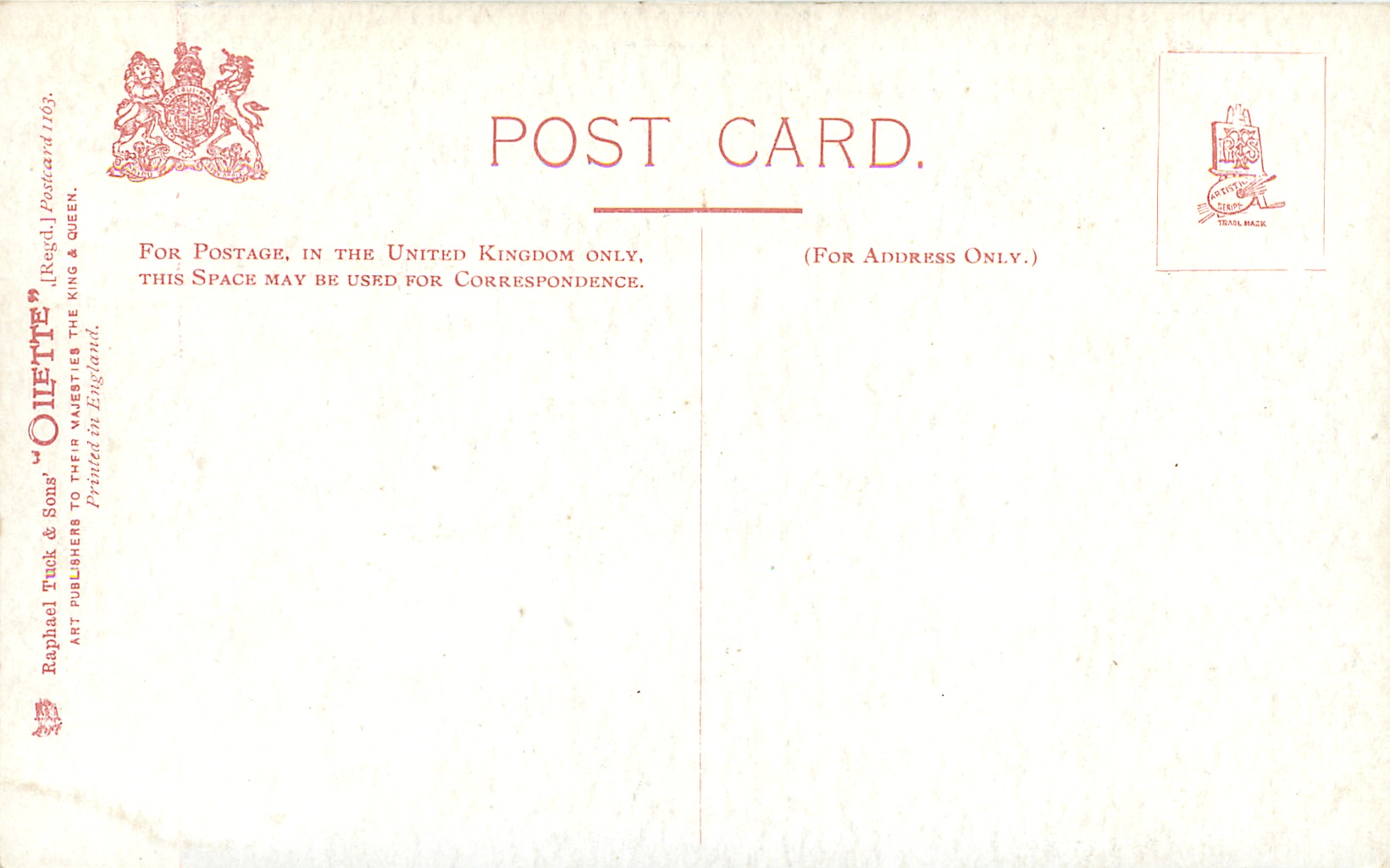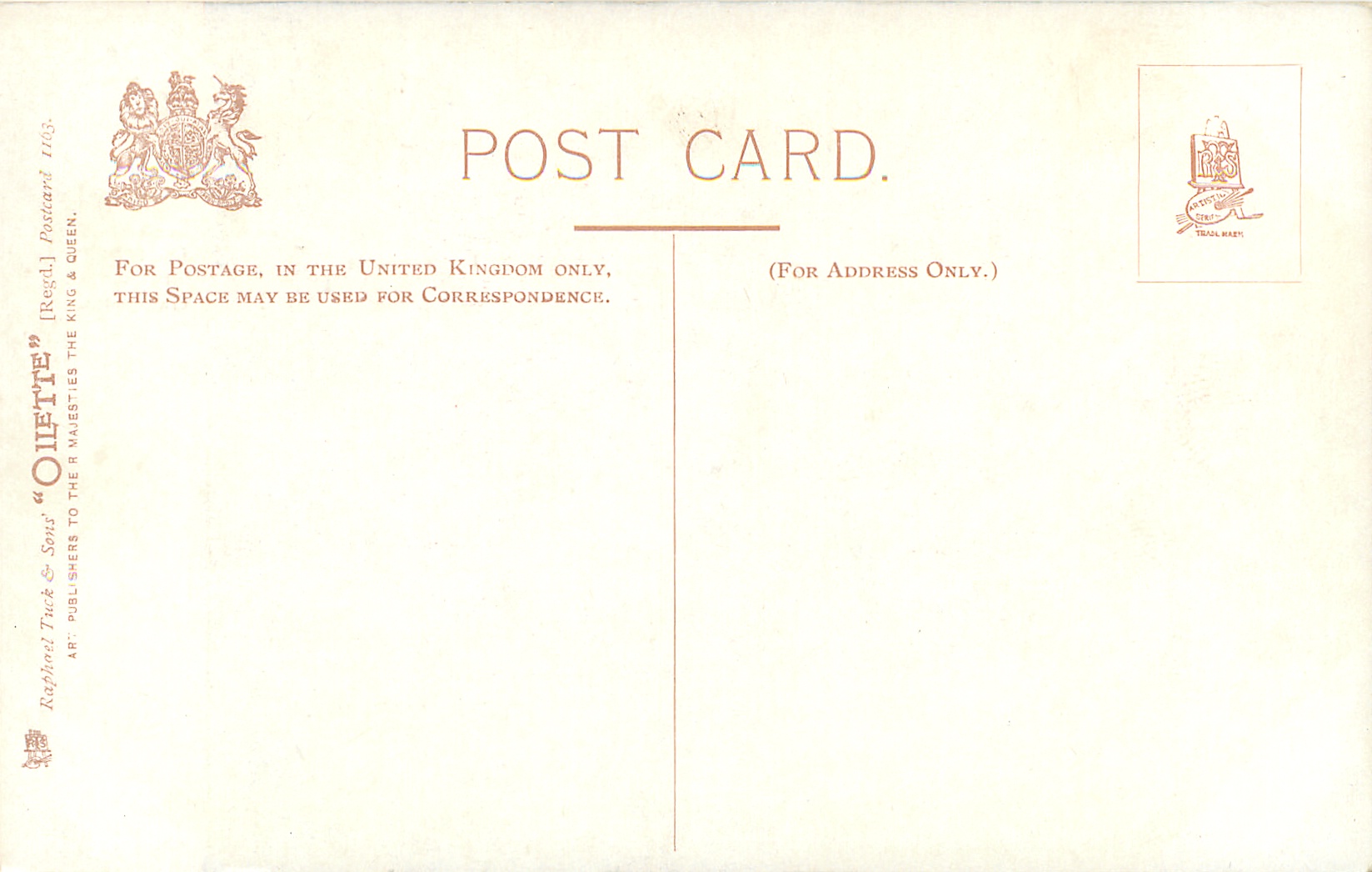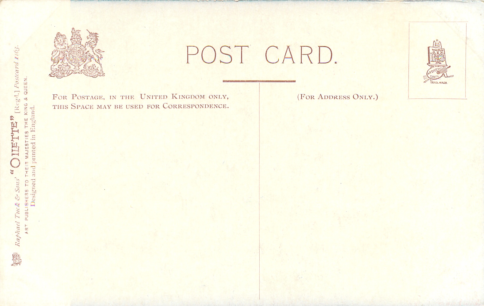 OILETTE or ART (u/b), 5 backs, u/b or d/b, PRINTED IN ENGLAND or not, come with & w/o white border for inscriptions, listed in 1904 & 1908/1909 & 1911/1912 Postcard Catalogues. 6 Cards in set cover all had white border with title.