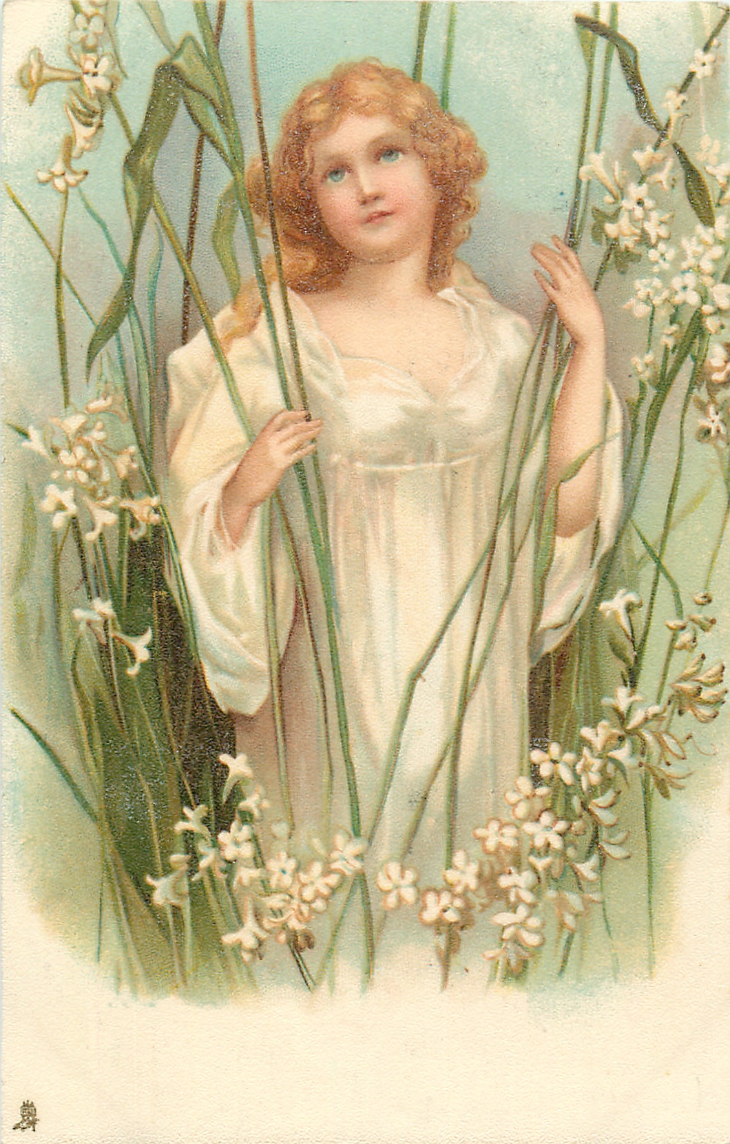 woman with golden hair, white dress, pushes through green reeds, white flowers, many stems at bottom, looks front/up