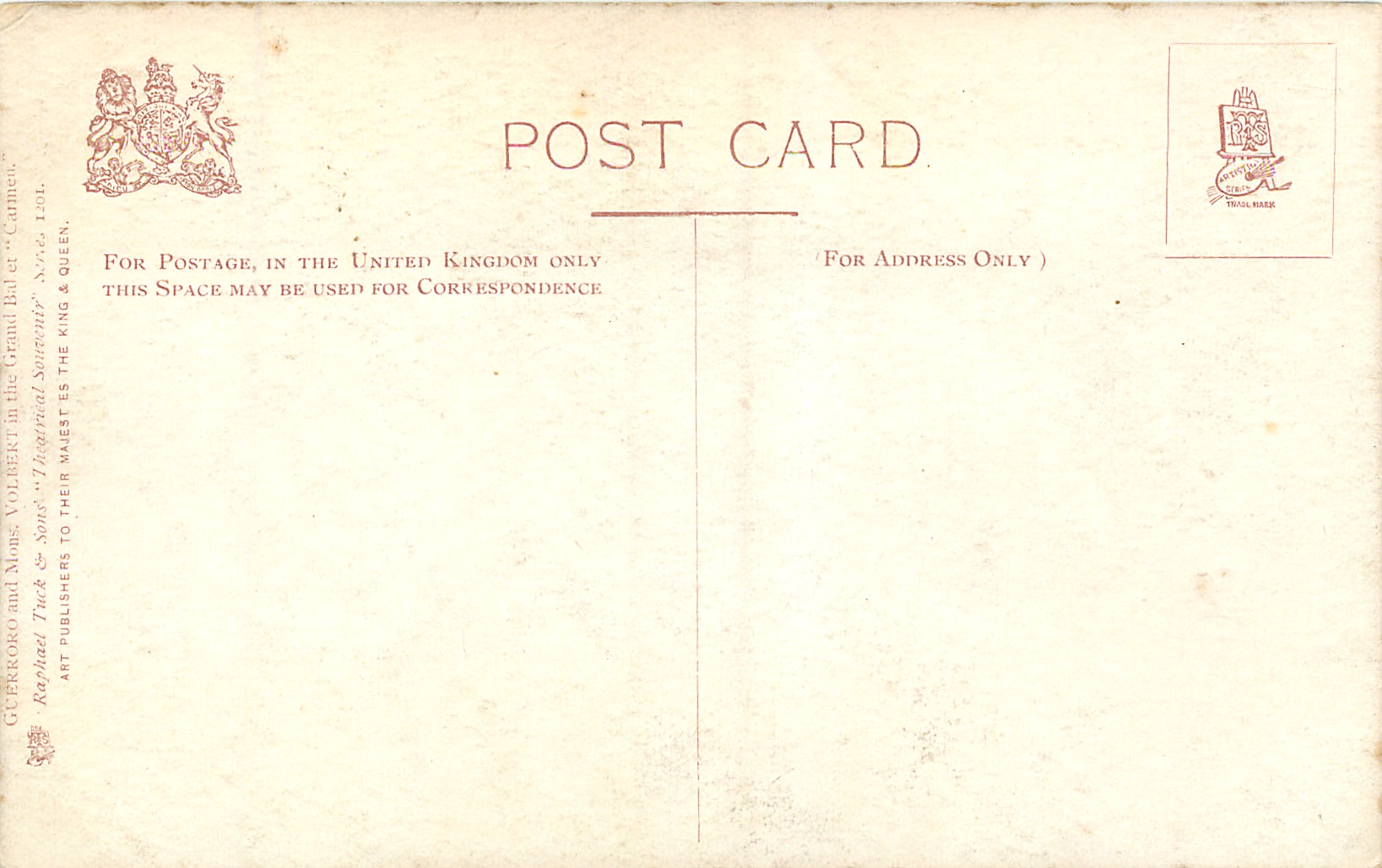 grey/black, THEATRICAL SOUVENIR, card titles on back, listed in 1904 POSTCARD Catalogue, same images, French back, SERIE 402