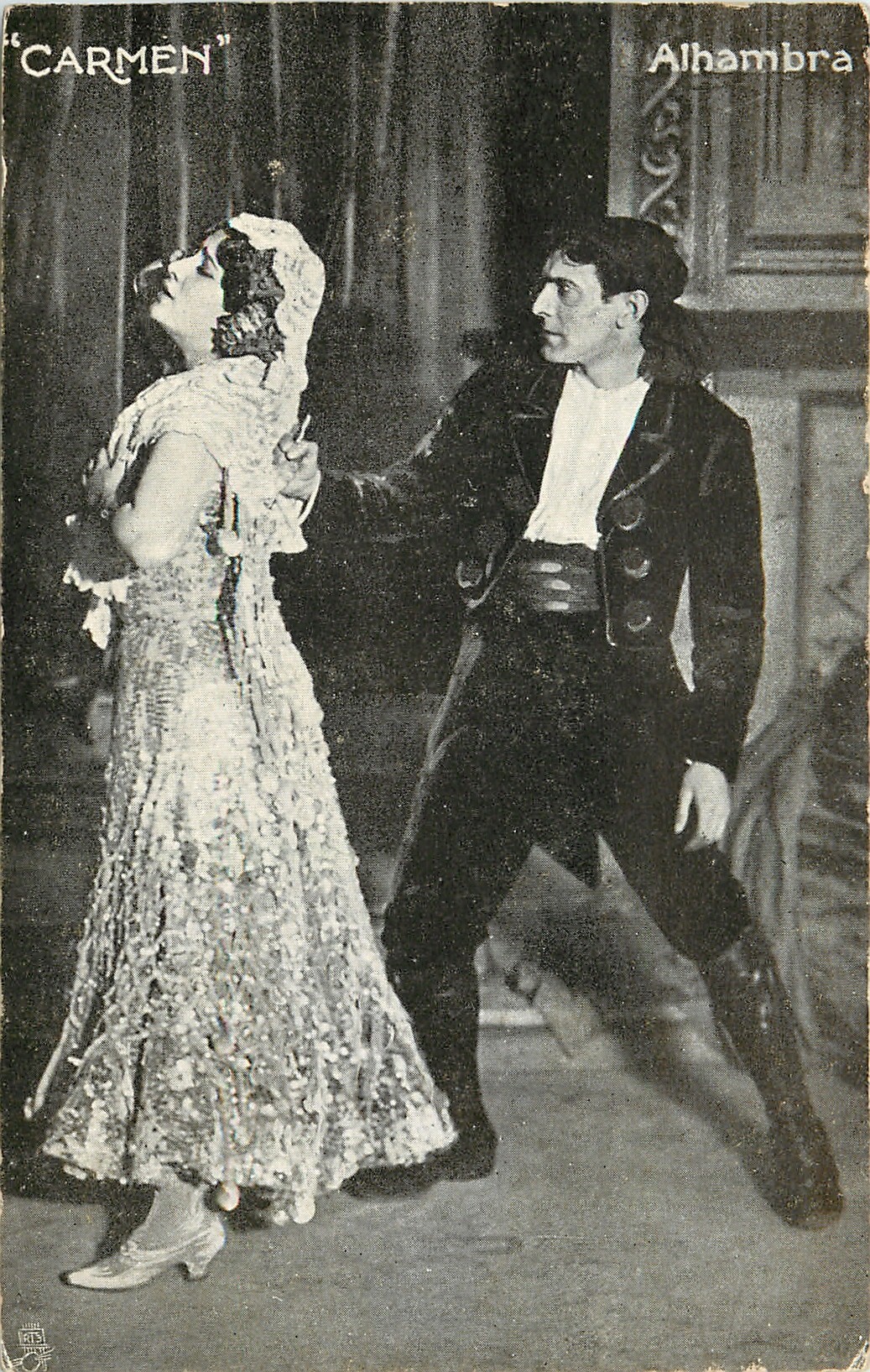 GUERRORO AND MONS. VOLBERT IN THE GRAND BALLET "CARMEN" woman and man standing, her back to him, his right fist holds back of her dress, man not in uniform