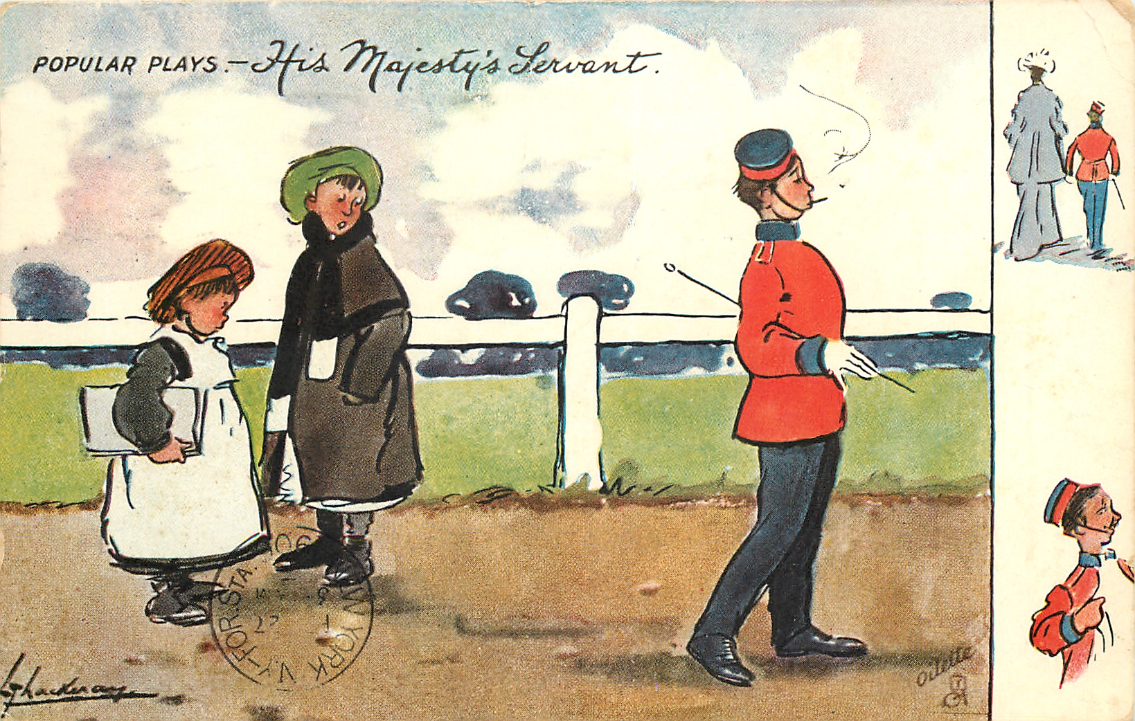 HIS MAJESTY'S SERVANT young boy in uniform walks right smoking cigarette observed by two girls