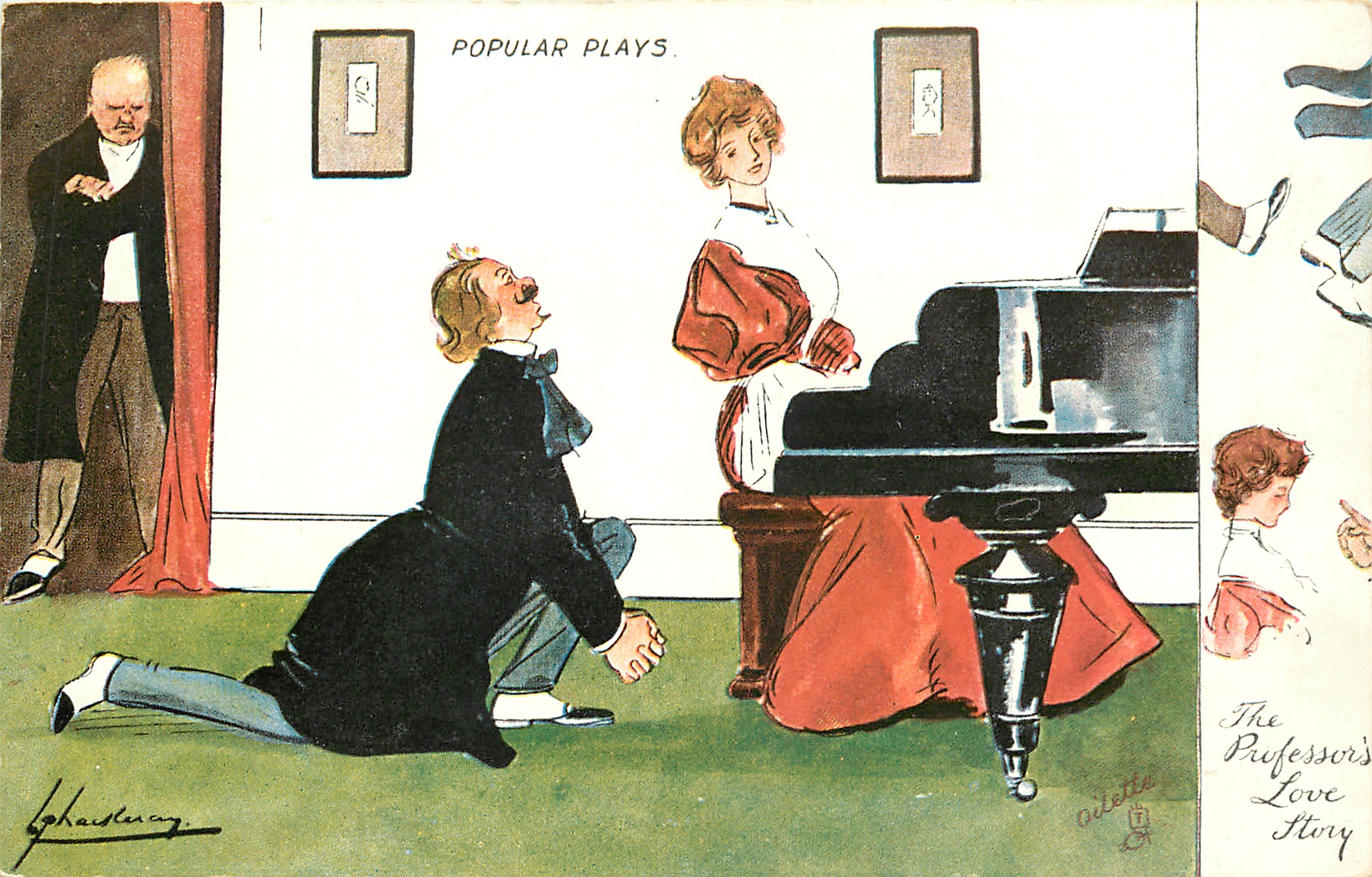 THE PROFESSOR'S LOVE STORY man on his knees impl;oring pretty girl at piano, father disapproves from doorway