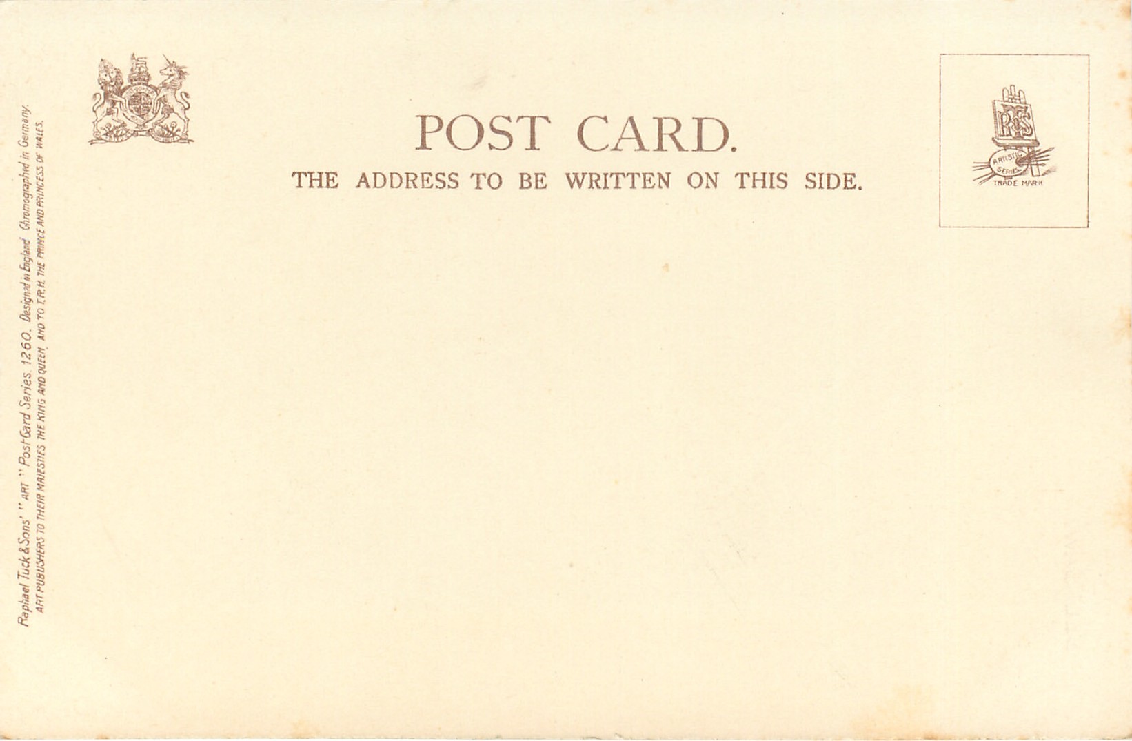 ART, DESIGNED IN ENGLAND, CHROMOGRAPHED IN GERMANY, same images 1749, see Booth and Lund, listed in 1904 POSTCARD Catalogue