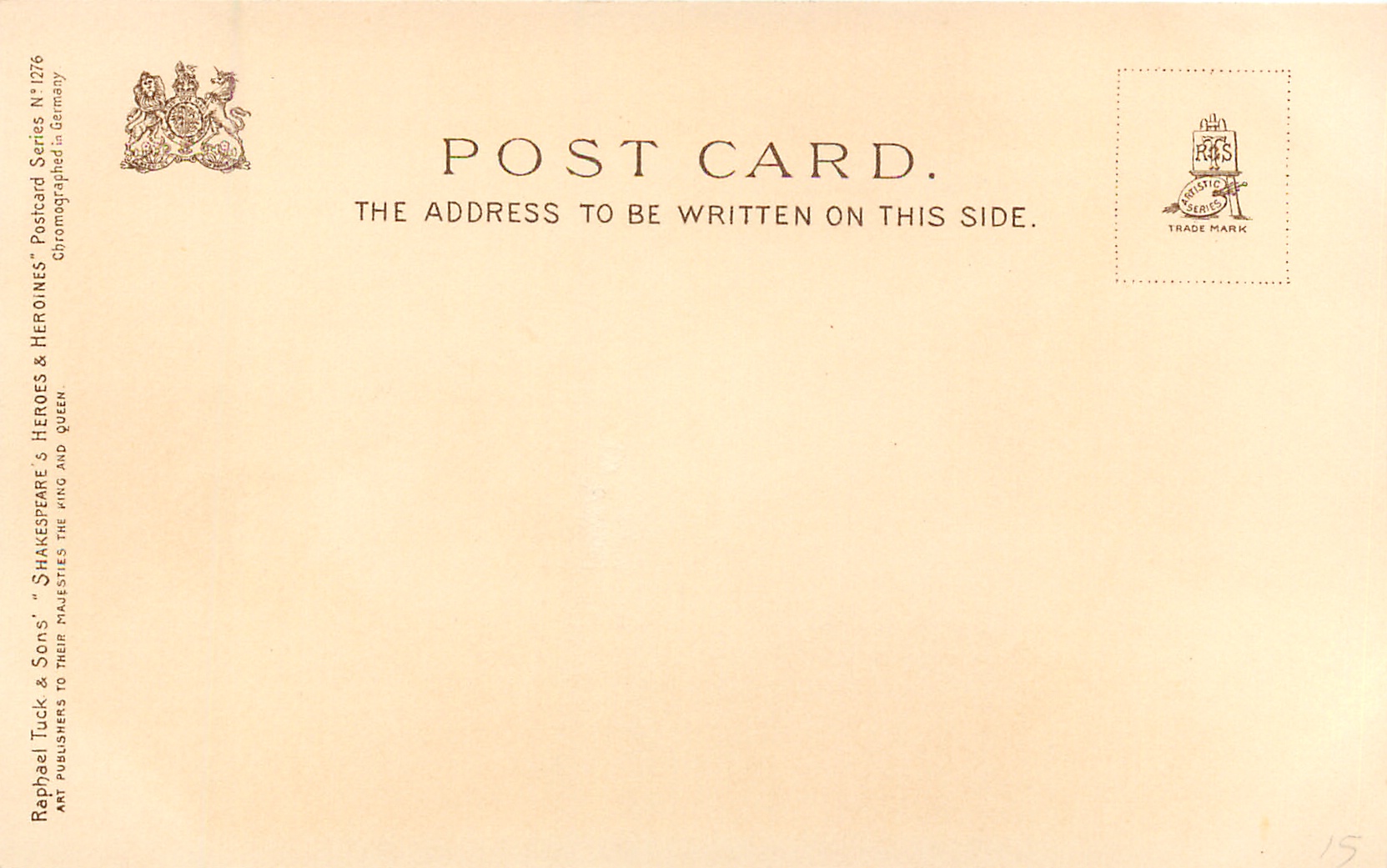 u/b, CHROMOGRAPHED IN GERMANY, SERIES I. on packet, not on cards, quotes from play at bottom of each card, listed in 1904 & 1908/1909 & 1911/1912 Postcard Catalogues