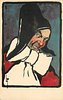 smiling man with large white bow tie, black cap, in red coat, facing right, looking front
