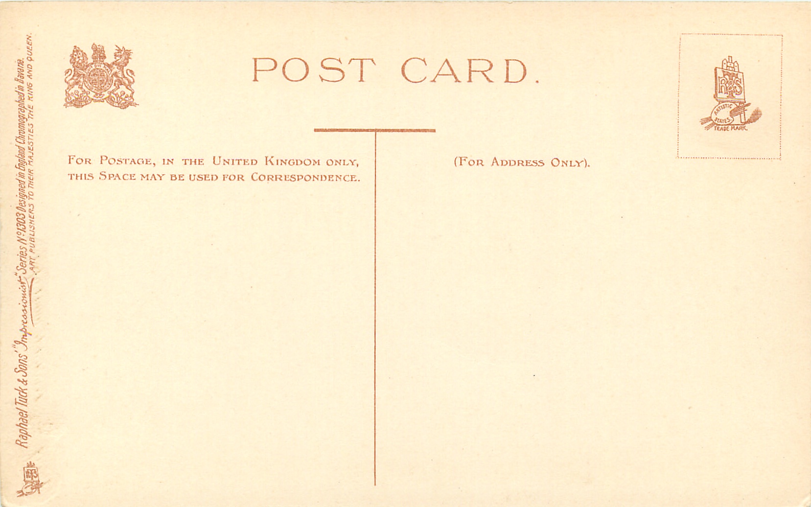 IMPRESSIONIST, DESIGNED IN ENGLAND, CHROMOGRAPHED IN BAVARIA, listed in U.S.1904 & 1908/1909 & U.K.1911/1912 & 1930 Postcard Catalogues, Proof EDITION 51 (12), same images CALENDAR 594, French backs SERIE 437/438