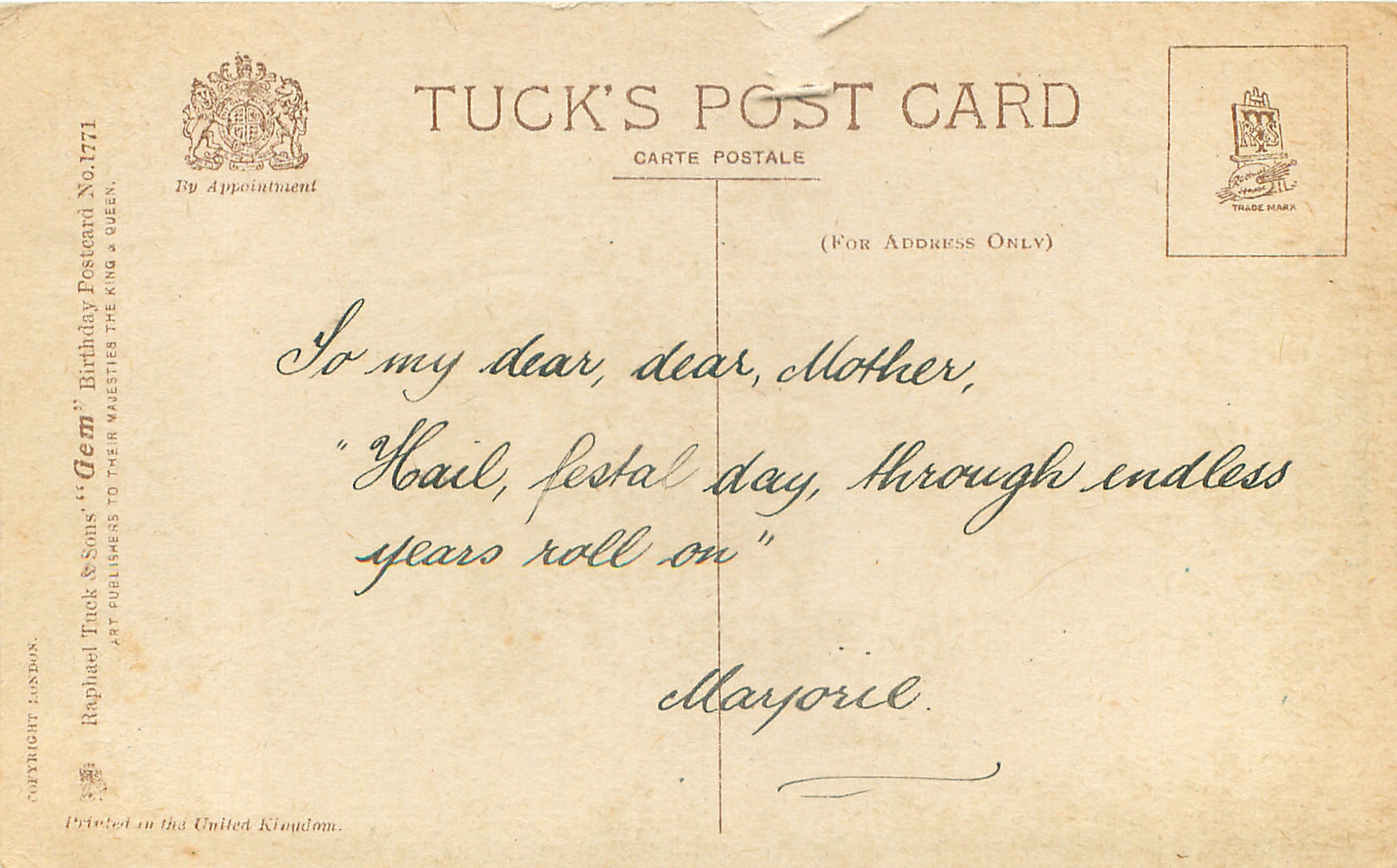 verse:- ALL JOY AND GLADNESS TO YOUR LOT. LOVE LIKE A GOLDEN THREAD RUN THROUGH THE SHINING CHAIN OF DAYS AS ON LIFE'S PATH YOU TREAD