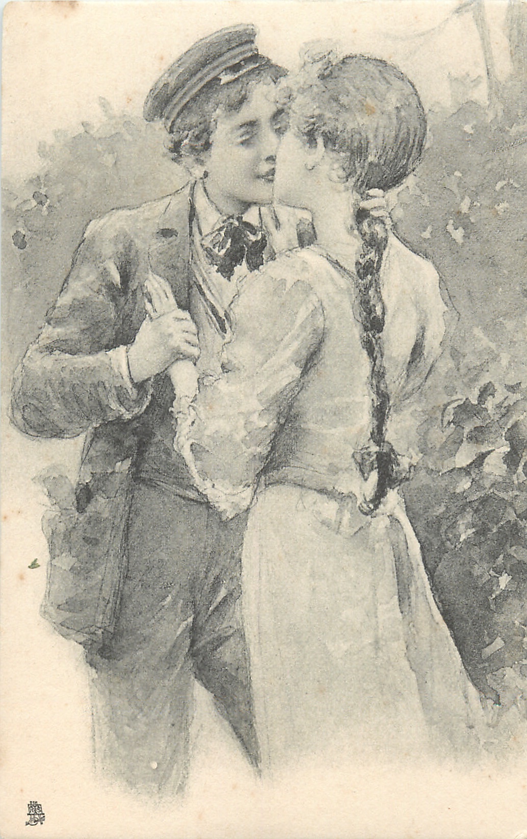 boy & girl kiss, she has pigtail, he holdss her wrist