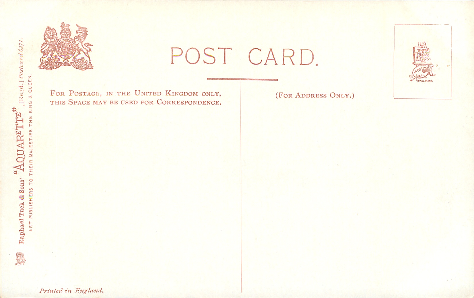 AQUARETTE, PRINTED IN ENGLAND, listed as ART in 1908/1909 & 1911/1912 Postcard Catalogue, listed as DICKENS in 1908/1909 Catalogue