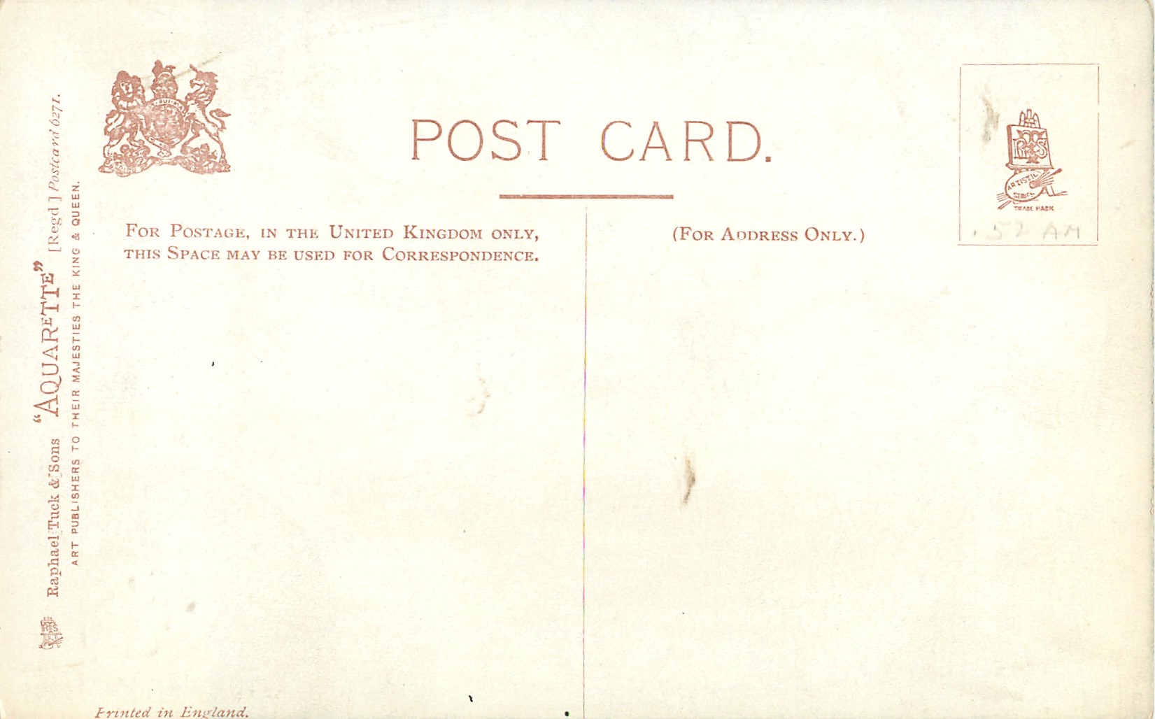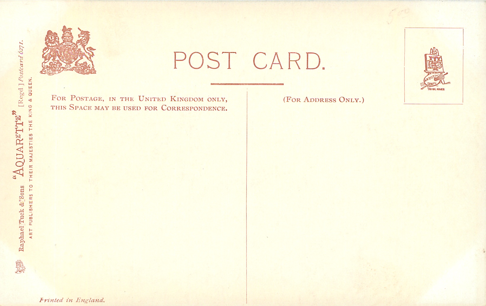 AQUARETTE, PRINTED IN ENGLAND, listed as ART in 1908/1909 & 1911/1912 Postcard Catalogue, listed as DICKENS in 1908/1909 Catalogue