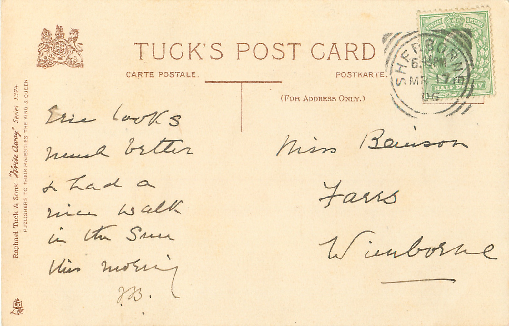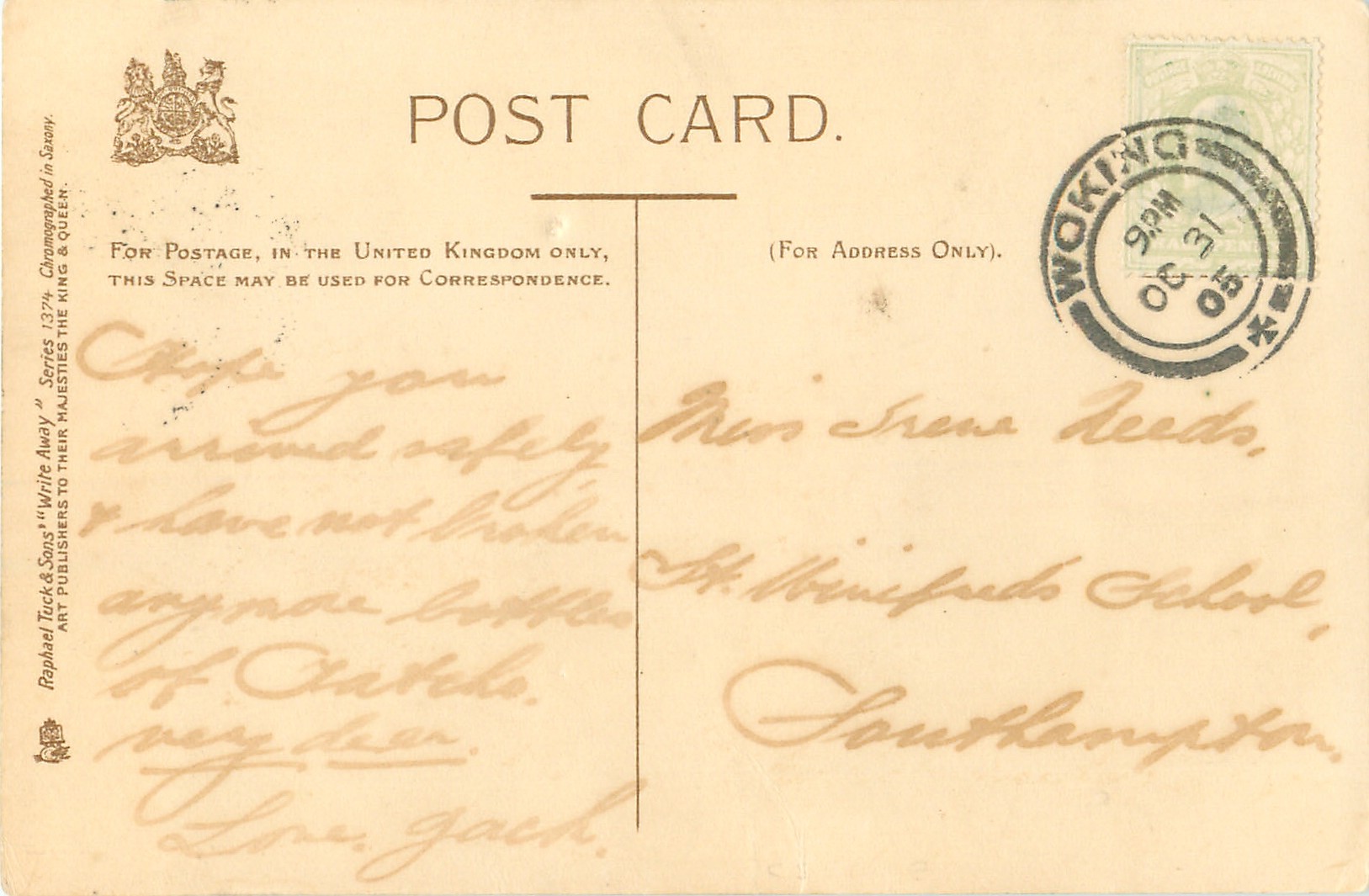 WRITE AWAY, CHROMOGRAPHED IN SAXONY (in stamp box or not), listed as WRITE AWAY in 1904 & 1908/1909 & 1911/1912 Postcard Catalogs, same images French backs SERIE 616