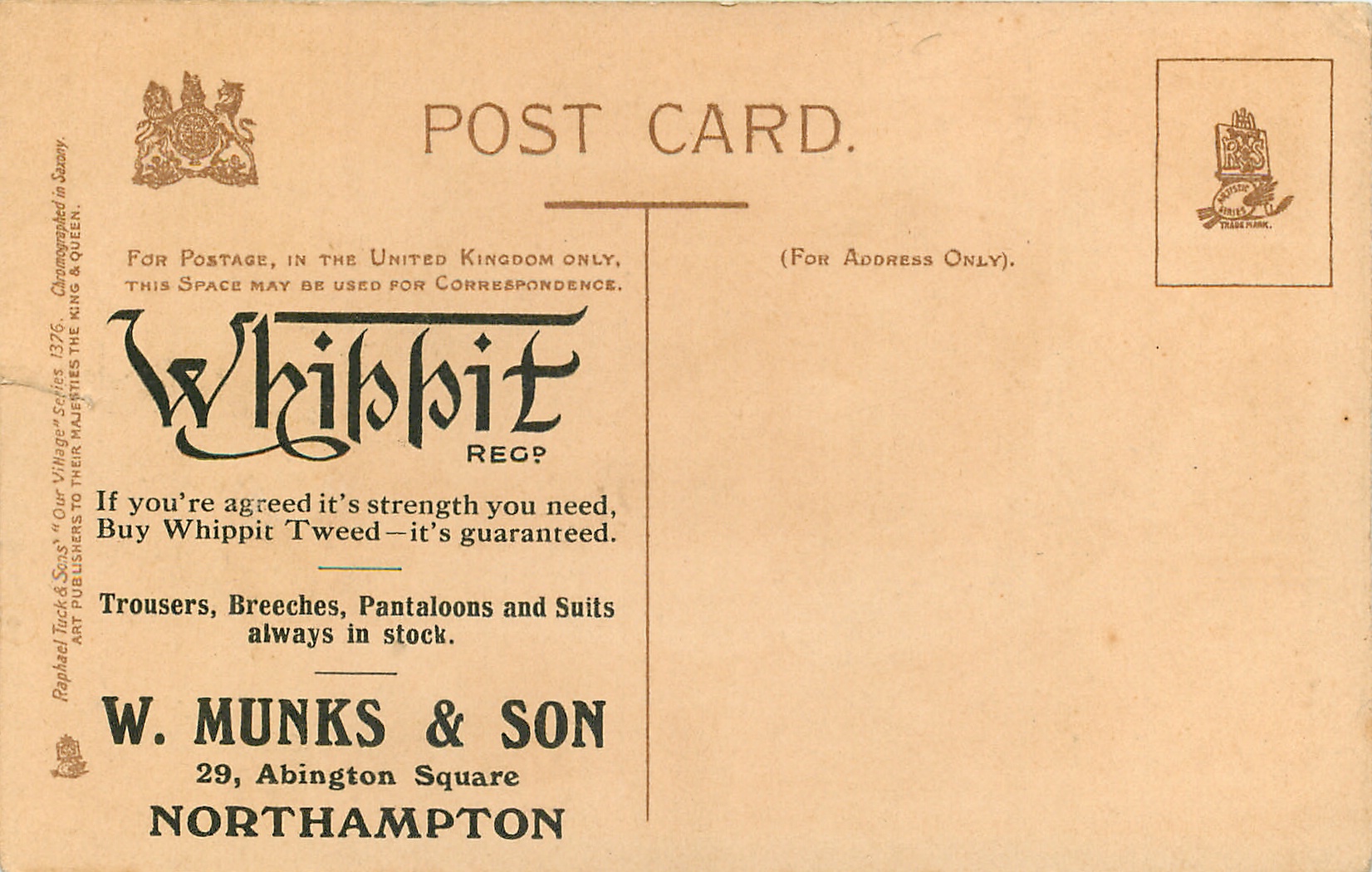 CHROMOGRAPHED IN SAXONY, come with various WHIPPIT TWEED ads on back, listed in 1904 & 1908/1909 & 1911/1912 Postcard Catalogues
