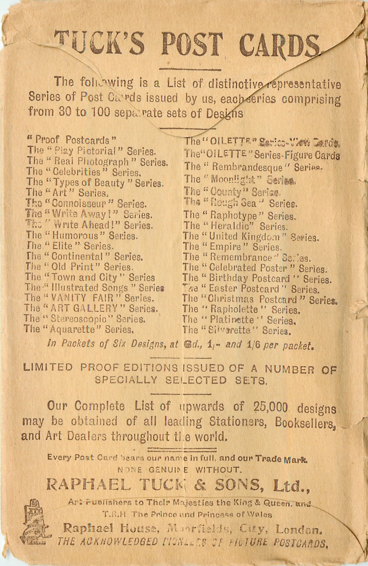 OILETTE, 2 backs, CHROMOTYPED or PROCESSED IN BAVARIA, come beaded, listed in 1904 & 1908/1909 & 1911/1912 & 1913/1914 & 1930 Postcard Catalogues, listed in TUCK'S TRAVELOGUES (USA?1905)