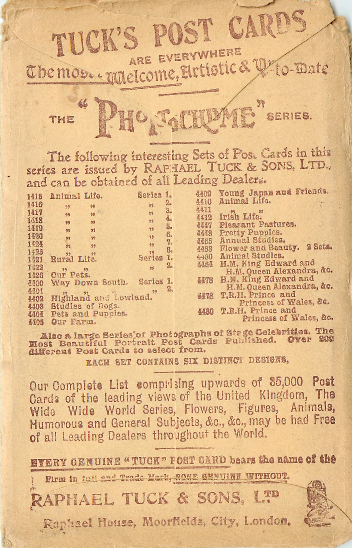 with or w/o PHOTOCHROME, listed in 1904 & 1908/1909 & 1911/1912 & 1913/1914 Postcard Catalogues, PHOTOCHROMED IN SAXONY (in stamp box) or CHROMO SAXONY (in stamp box) or CHROMOTYPED IN SAXONY
