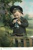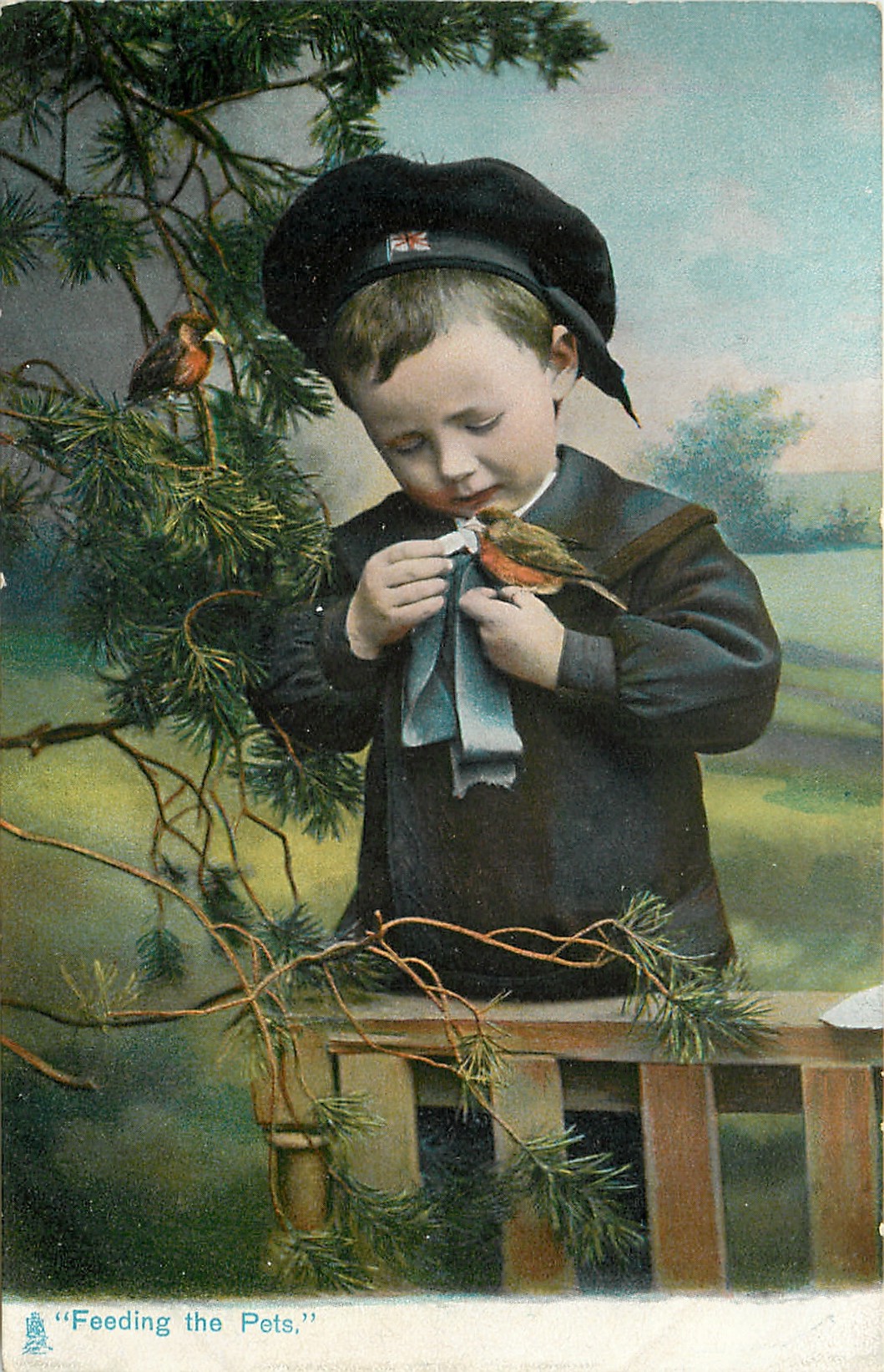 "FEEDING THE PETS." boy feeding finch on hand, another in branches
