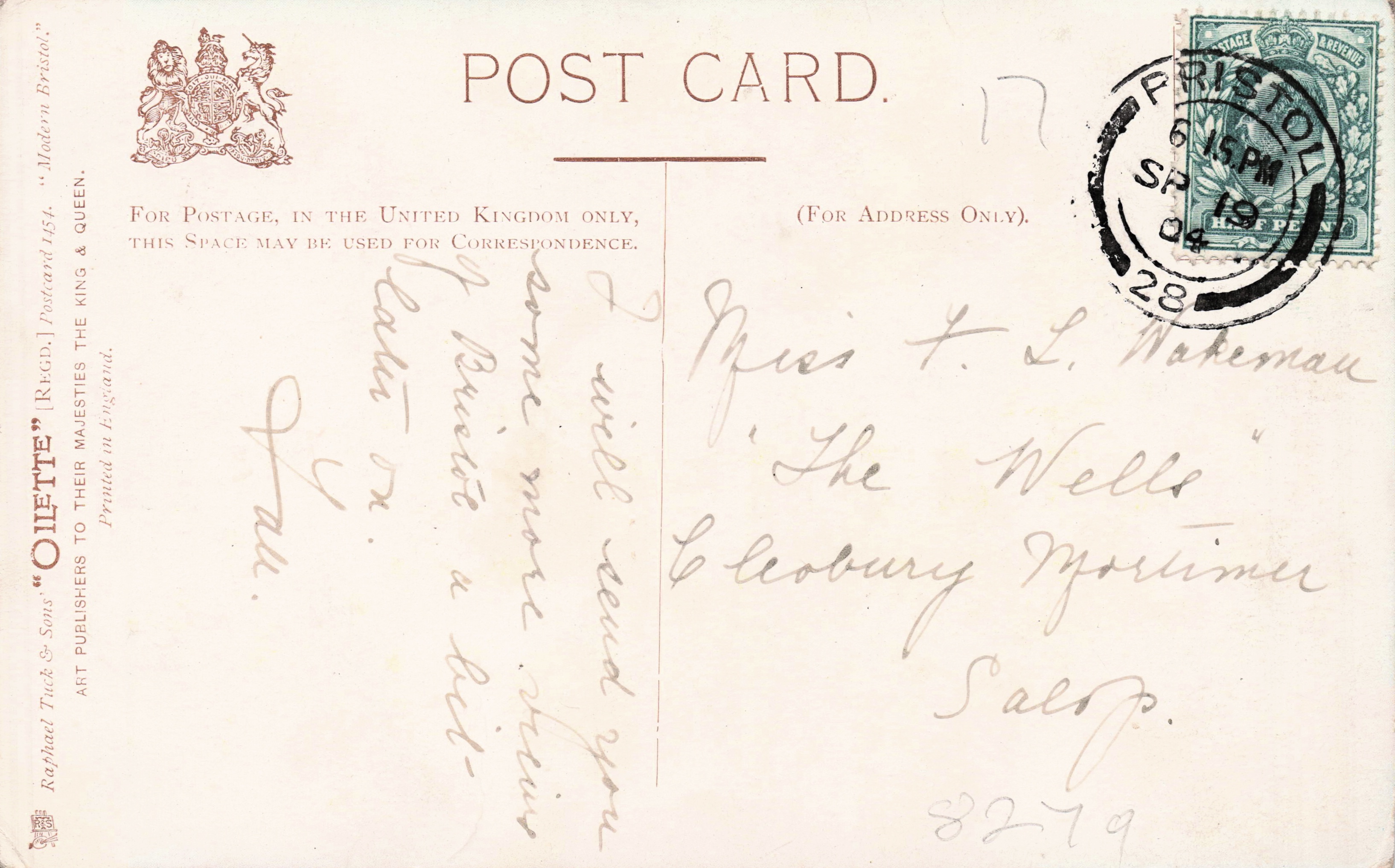 OILETTE, PRINTED IN ENGLAND, 2 backs, come with gilt opt. ARMS OF BRISTOL, come opt. in black on front, local publisher R.F. HOULSTON. CHIPPENHAM & BATH, listed in 1904 & 1911/1912 Postcard Catalogue, listed in RAPHAEL TUCK & SONS' LD. CHRISTMAS & NEW YEAR 1904/1905 catalogue