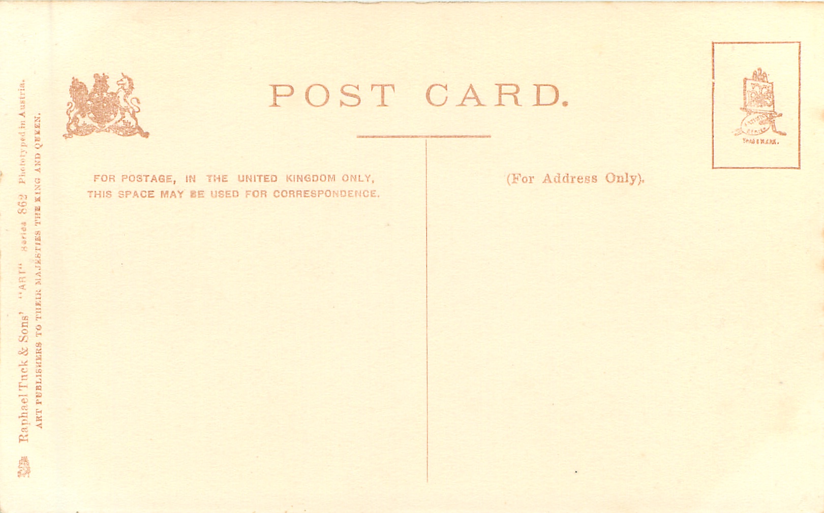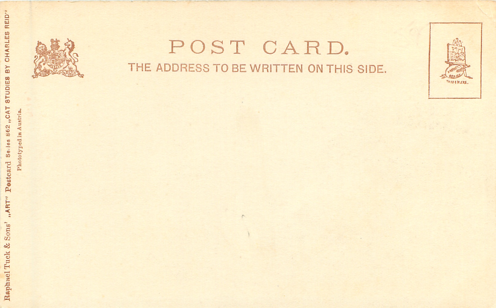 u/b or divided back, grey, ART, 4 backs PHOTOTYPED IN AUSTRIA, come with CAT STUDIES BY CHARLES REID on back, many of same images come in ART sets 862-865 & REAL PHOTOGRAPH 5089/93 & in PHOTOCHROME 6495/6496 CAT STUDIES & 7006/7007 SAPPHIRE, French backs in long sets SERIE 252 & SERIE 409, listed in 1904 POSTCARD Catalogue