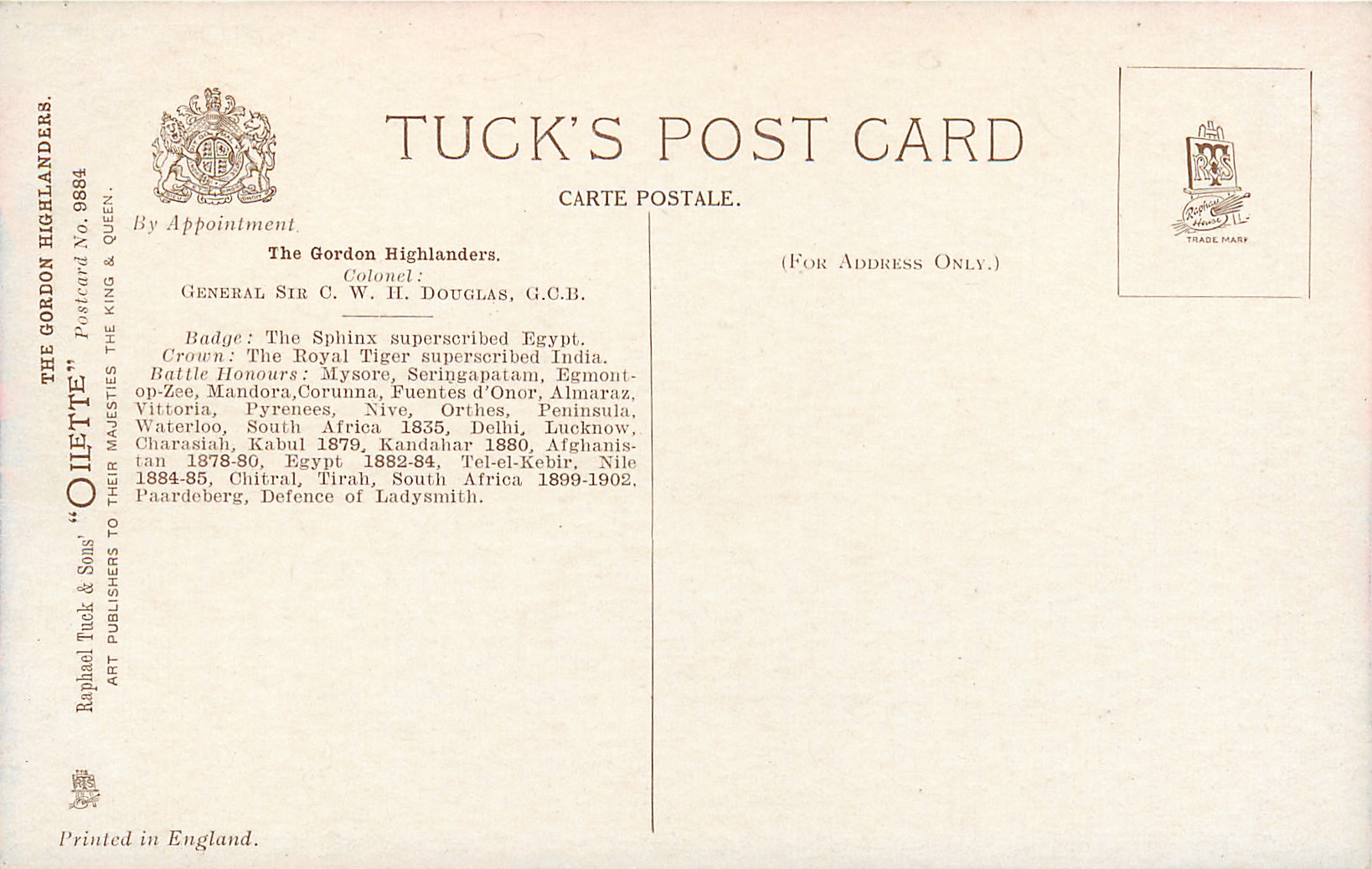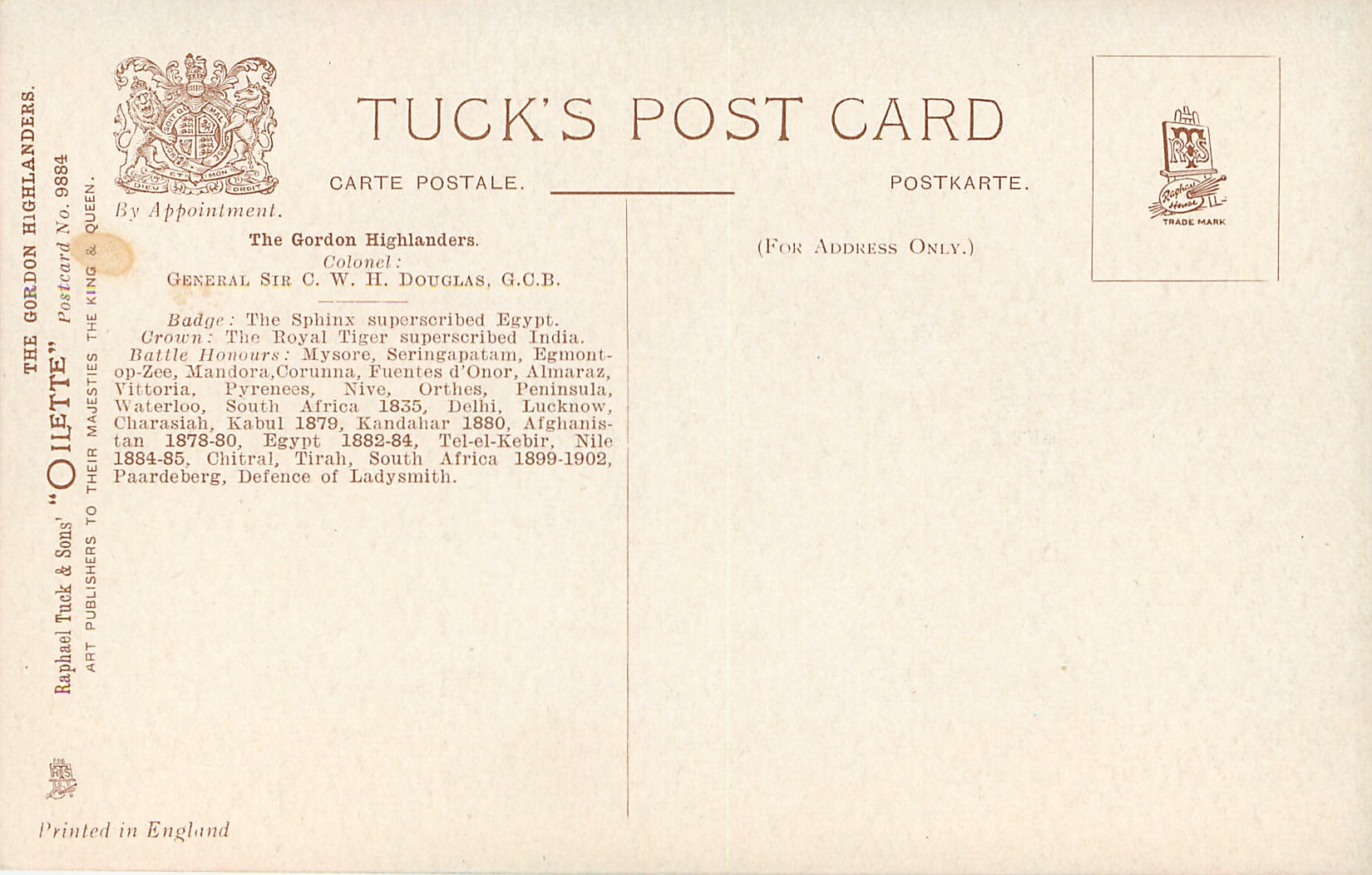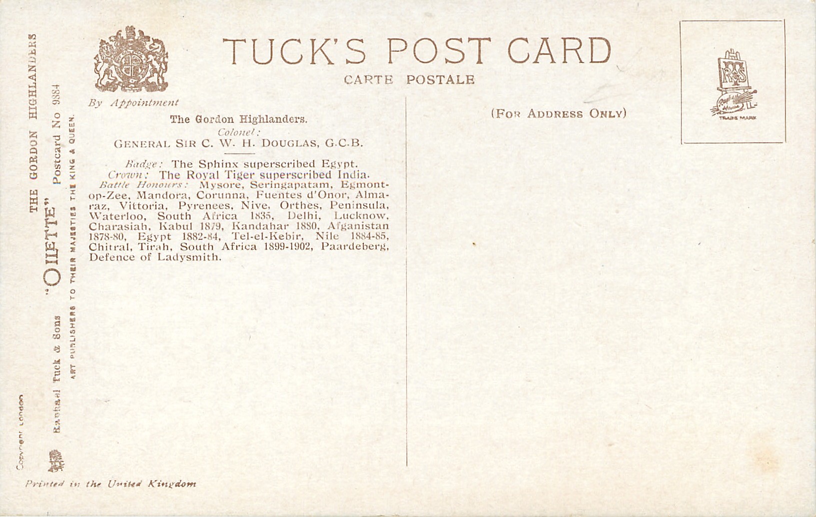 5 backs, OILETTE, PRINTED IN ENGLAND, with or w/o COPYRIGHT LONDON, listed in 1911/1912 & 1913/1914 Postcard Catalogues, this set was also sold at 1924 Wembley Exbn, see Perkins & Tonkin, PRINTED IN THE UNITED KINGDOM, come oilfacsim but not so tradenamed