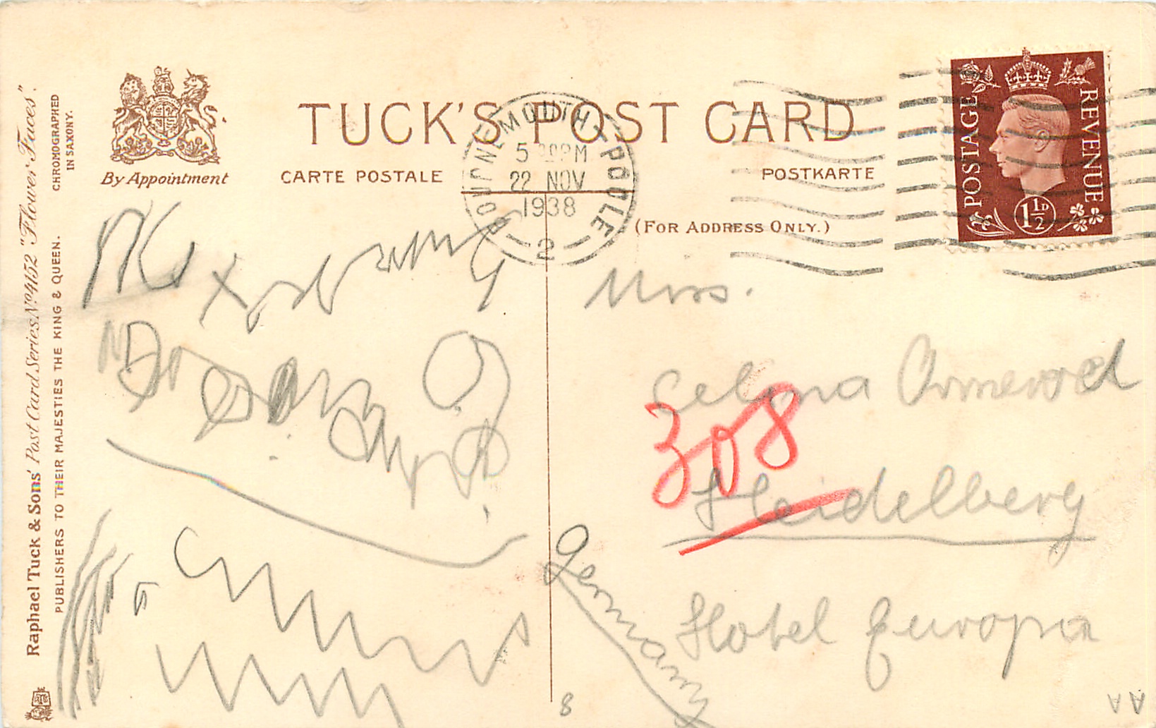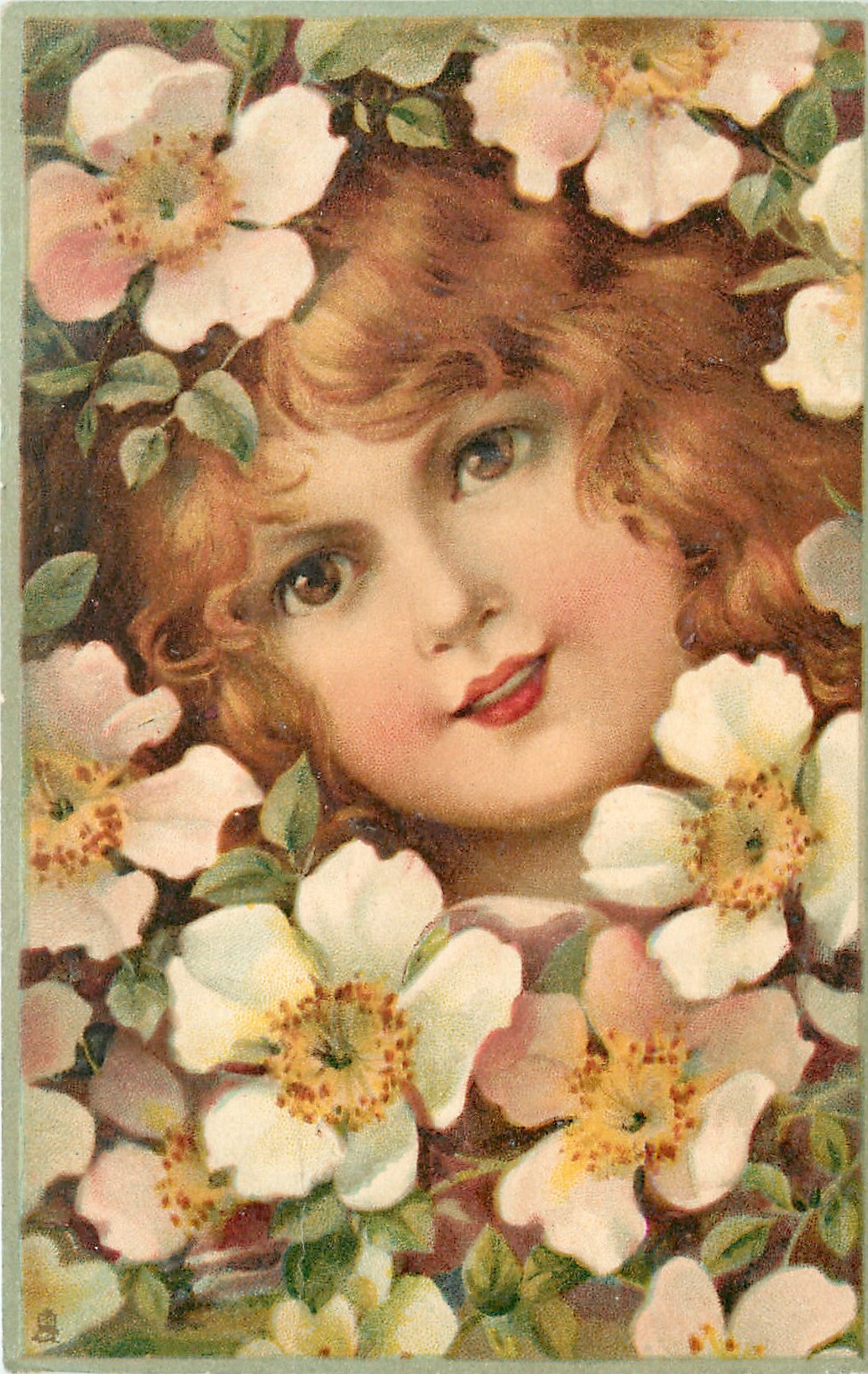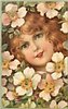 girl's face surrounded by five petal pink/white roses, girl looks forward, one lone flower upper left corner