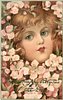 girl's face surrounded by five petal pink/white roses, girl looks to right