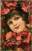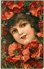girl's face surrounded by pansy flowers, girl looks forward