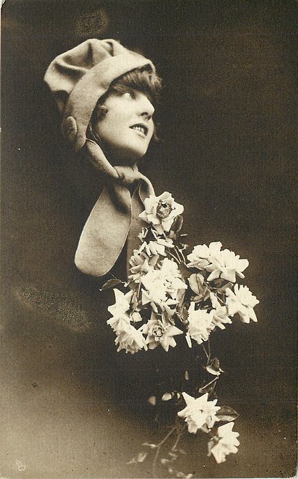 girls head looking to right, only one eye visible, with scarf tied over hair, next to pink roses