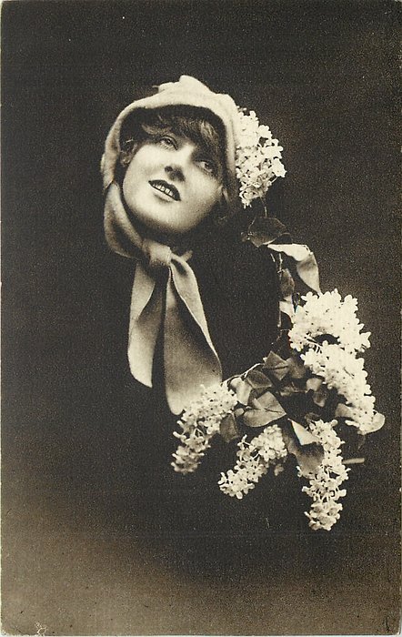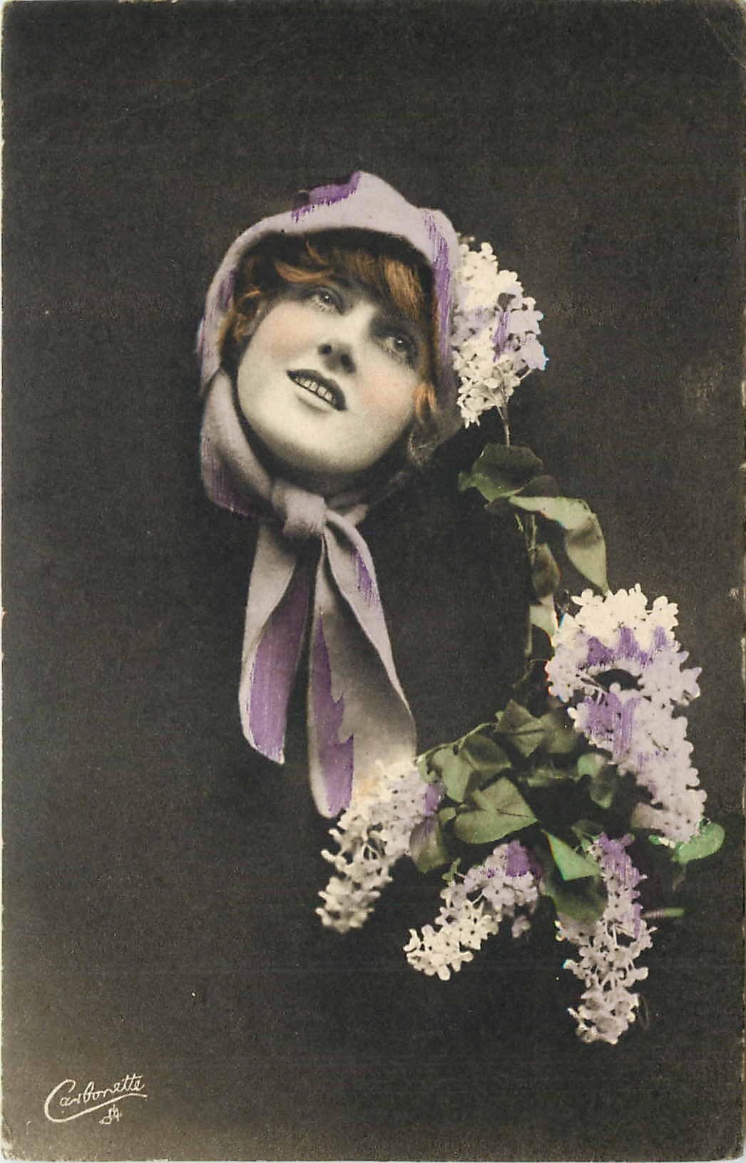 girls head looking forward & slightly up with scarf tied over hair, next to lilac