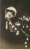 girls head looking up to left with scarf tied over hair, next to blue harebells