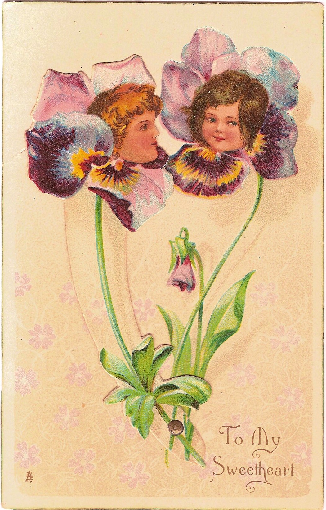 TO MY SWEETHEART / I THINK OF THEE two pansies with girls faces