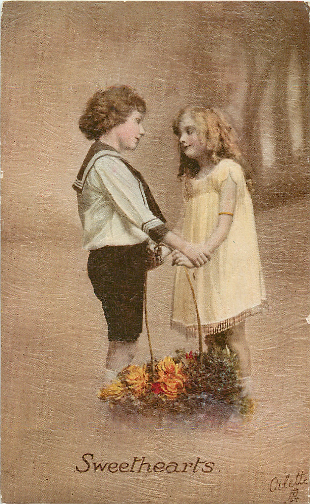 SWEETHEARTS boy in sailor top, girl in yellow dress, they look in each others eyes whilst holding hands, flower basket