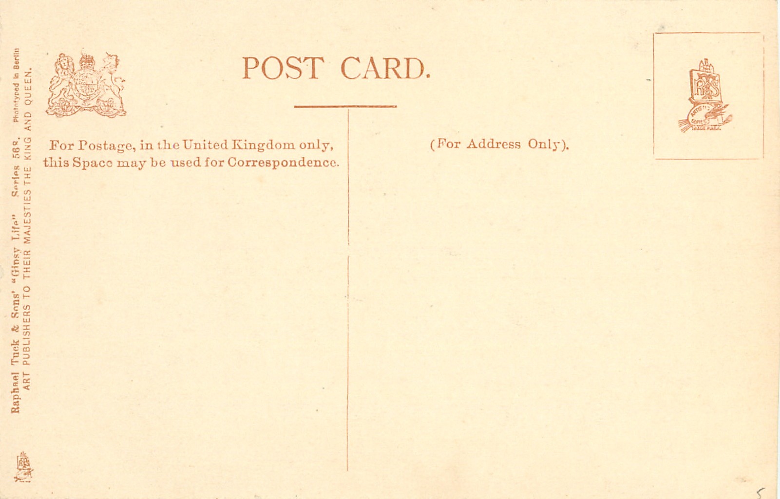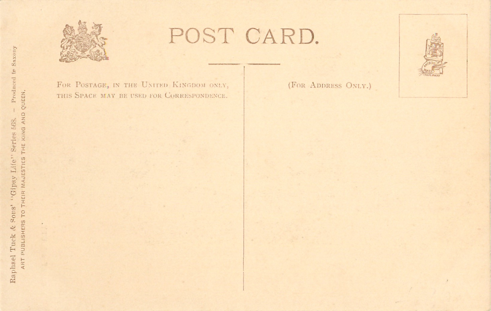 sepia or grey black, u/b PHOTOTYPED IN SAXONY, divided back PRODUCED IN SAXONY or PHOTOTYPED IN BERLIN, , listed in 1904 POSTCARD Catalogue, same images recorded i.n. 3657-3662 but we do not think these were ever made. recommended spelling is now gypsy