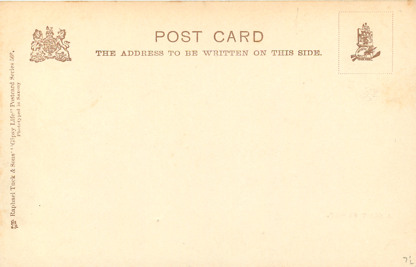 sepia or grey black, u/b PHOTOTYPED IN SAXONY, divided back PRODUCED IN SAXONY or PHOTOTYPED IN BERLIN, , listed in 1904 POSTCARD Catalogue, same images recorded i.n. 3657-3662 but we do not think these were ever made. recommended spelling is now gypsy