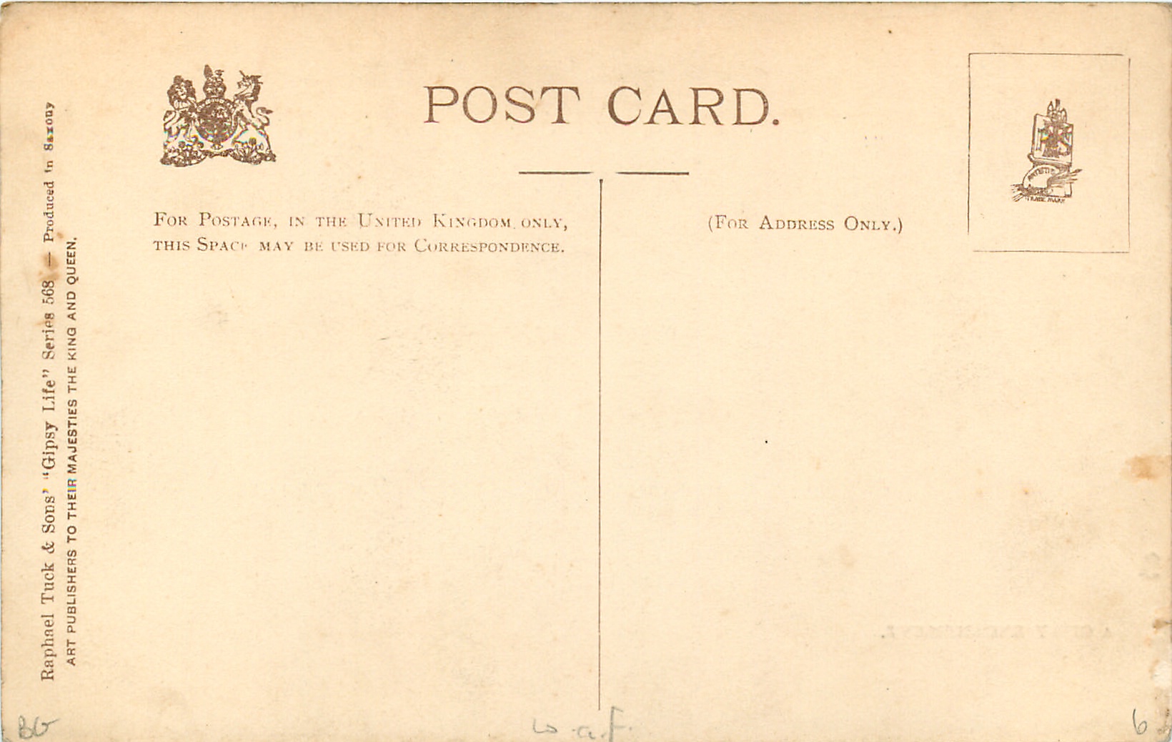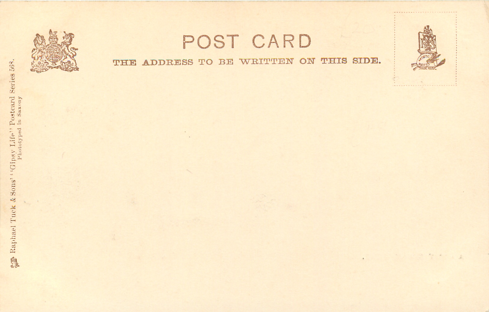 sepia or grey black, u/b PHOTOTYPED IN SAXONY, divided back PRODUCED IN SAXONY or PHOTOTYPED IN BERLIN, , listed in 1904 POSTCARD Catalogue, same images recorded i.n. 3657-3662 but we do not think these were ever made. recommended spelling is now gypsy