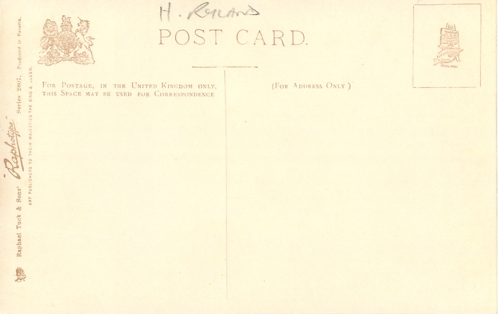 grey/green or sepia, RAPHOTYPE, PRODUCED IN BAVARIA, same images 2907, listed in 1904 POSTCARD Catalogue