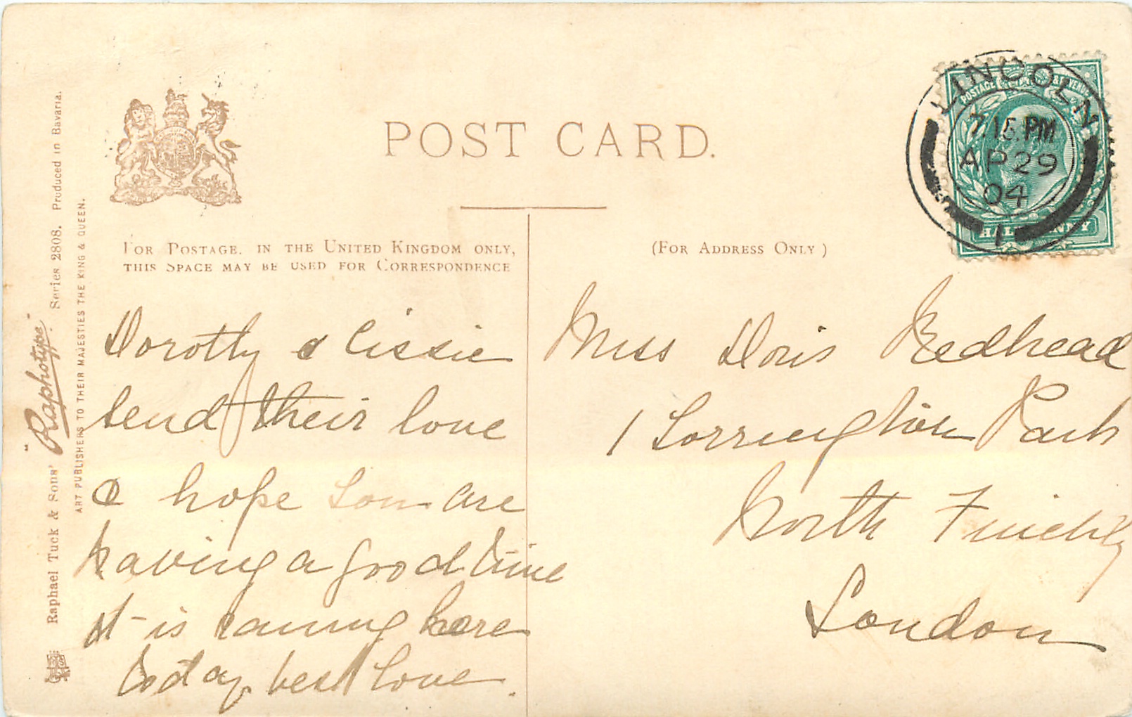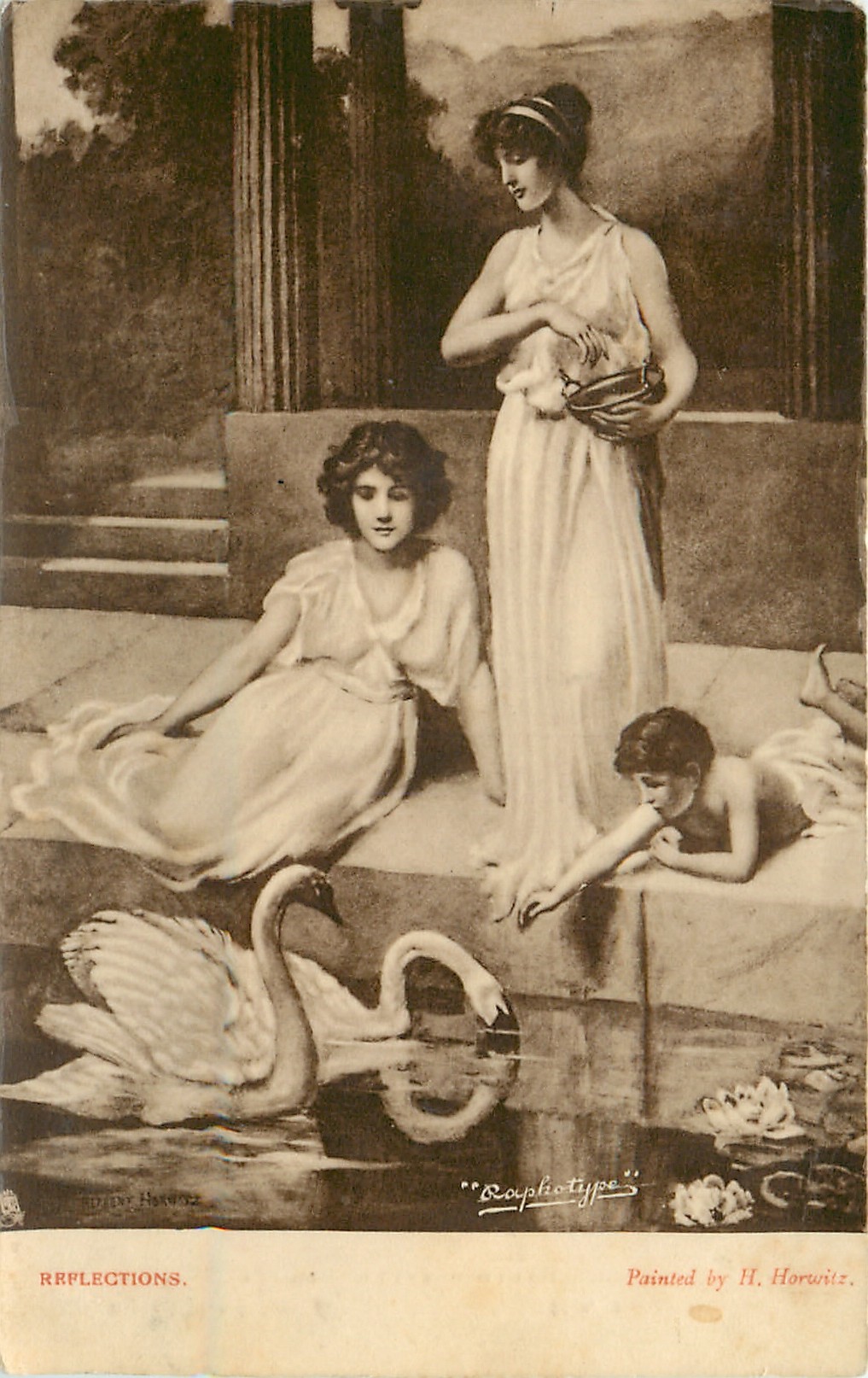 grey-green or sepia, RAPHOTYPE, 2 backs, PRODUCED or PHOTOTYPED IN BAVARIA (in stamp[ box), same images 2908, PAINTED BY H. HORWITZ., listed in 1904 POSTCARD Catalogue